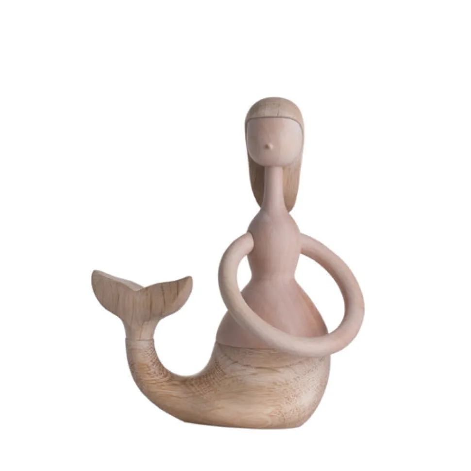 Havfruens hoved og hale er lavet af egetræ, og kroppen er lavet af ahorntræ. Hovedet, finnen og taljen kan drejes, så havfruen får det ønskede udtryk.