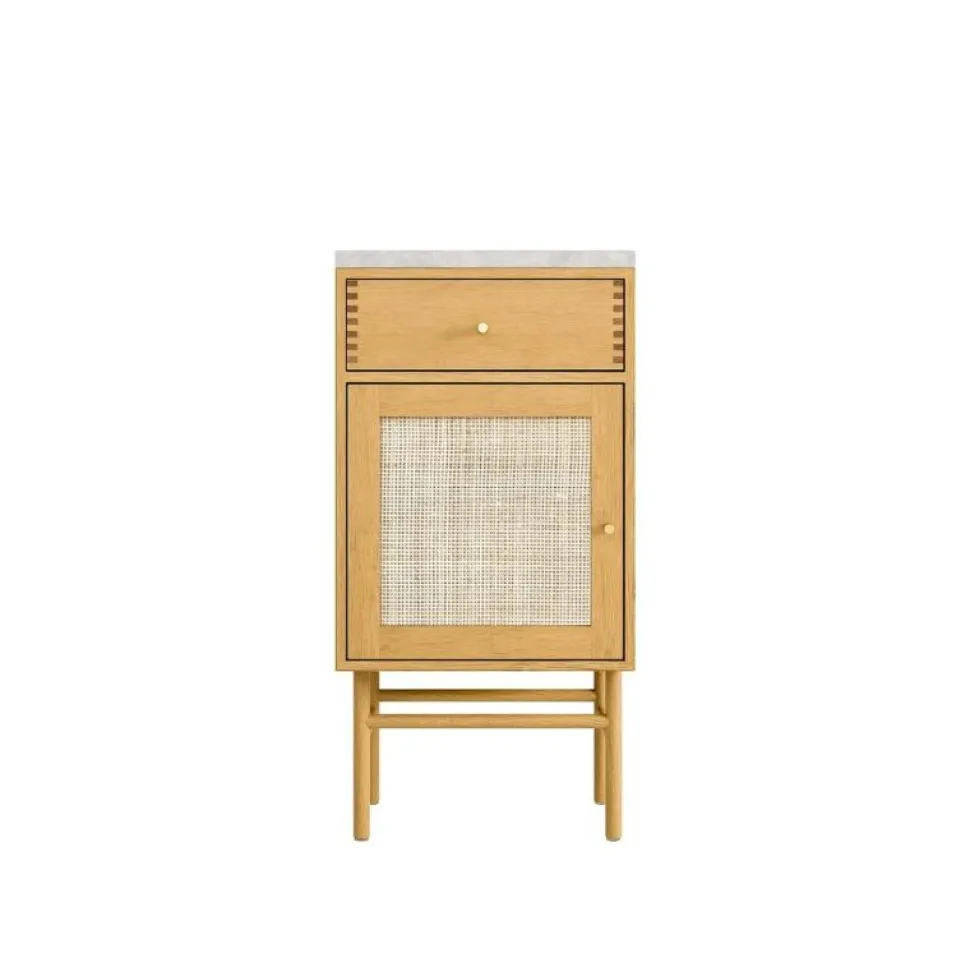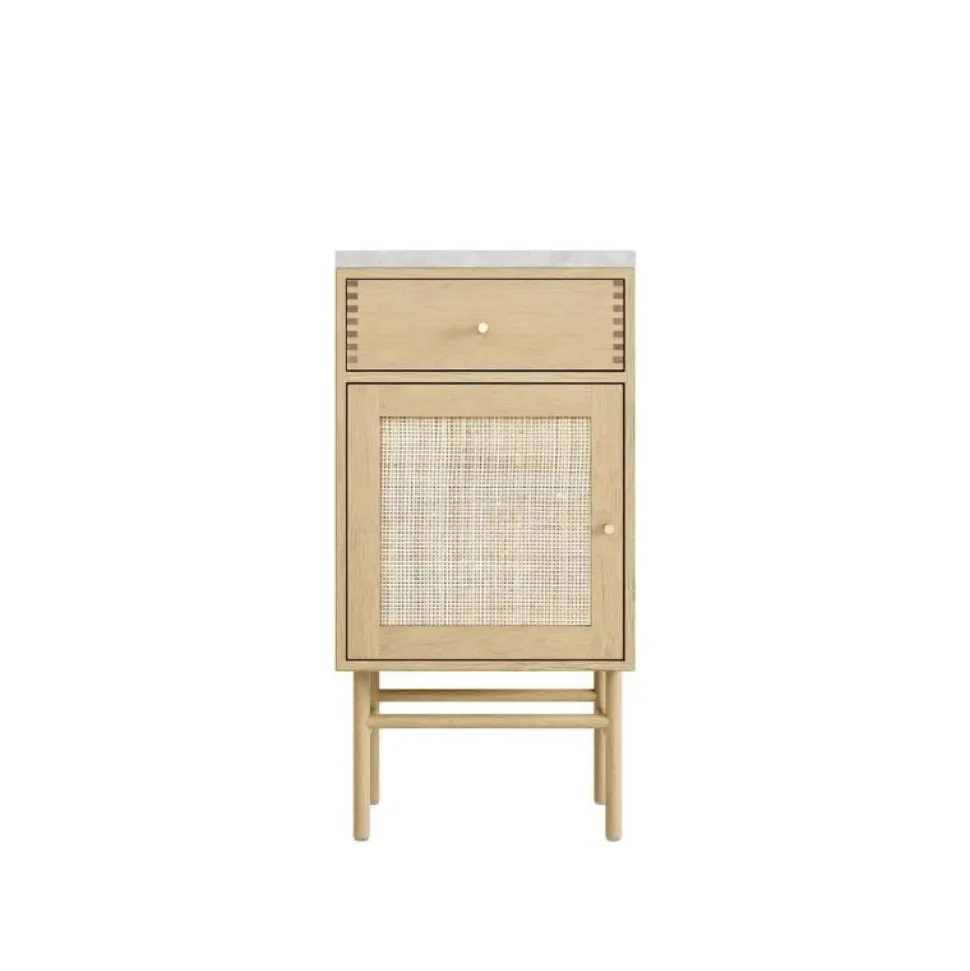Sengebordet fra ATBO kommer med en både en lille top skuffe samt en flet låge, som elegant afskærmer dine opbevaring. Alle ATBO reoler i massivt træ har unikke “Finger-tapping” samlinger. Her er sengebordet vist med Italiensk marmor top plade, som kan tilkøbes.