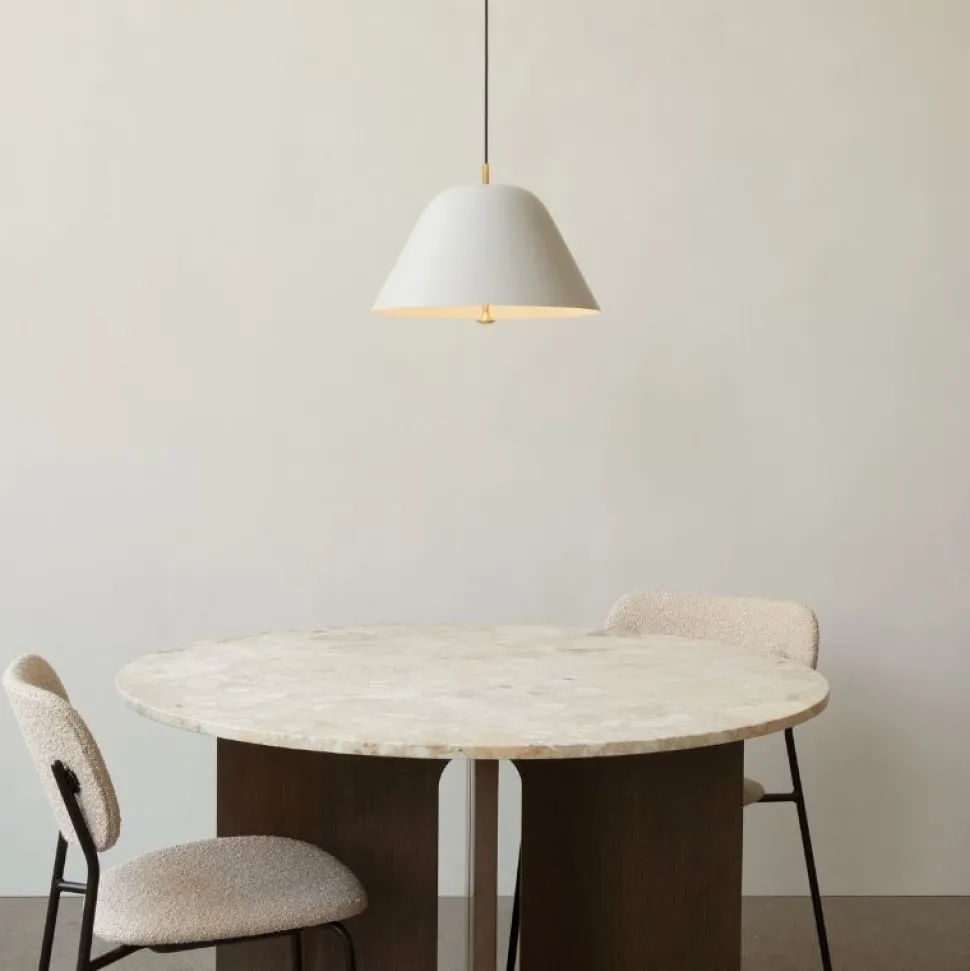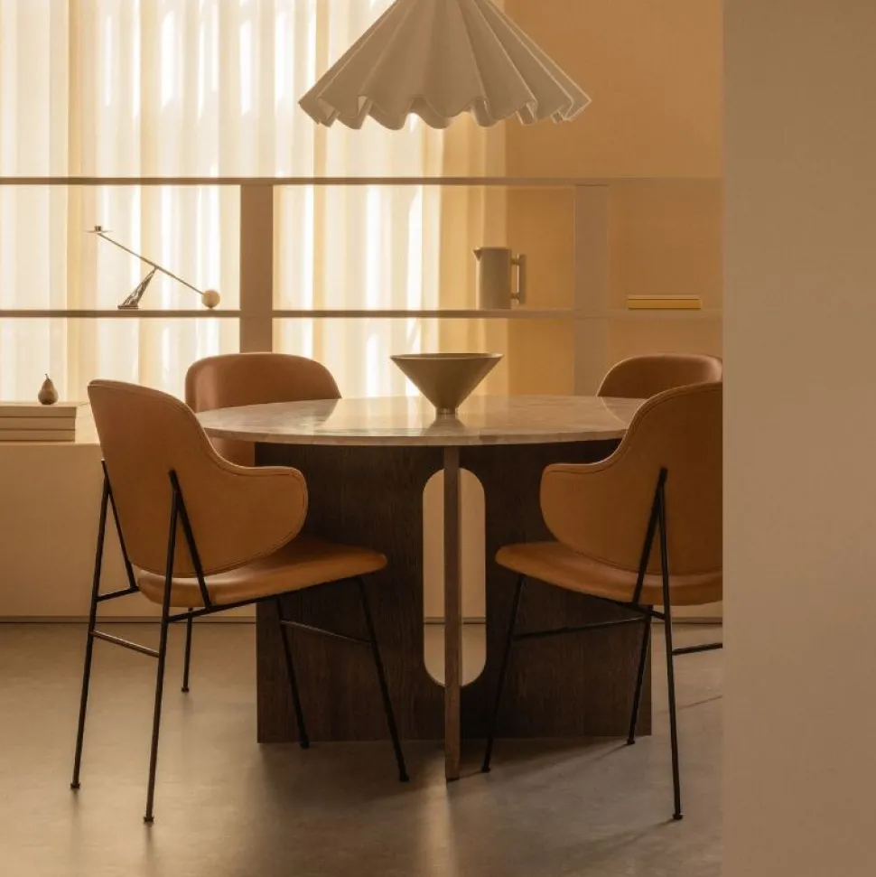 Bordet fås i to størrelser og flere materialekombinationer, herunder olieret eller mørkbejdset eg, samt Ø120 cm med træunderstel og en bordplade i eksklusiv marmor eller sten. Disse muligheder giver dig friheden til at sammensætte et bord med kontrasterende teksturer og finish, der passer til netop din indretning og stil.
