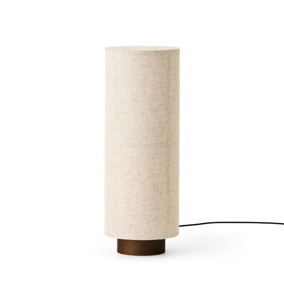 Hashira-serien med de slanke cylindriske lamper gennemskinnelige stof, som på japanske lanterner og persienner, spreder blødt lyset i flere retninger. Bordlampen er sat på en askebase, som understøtter det minimalistiske udtryk.
