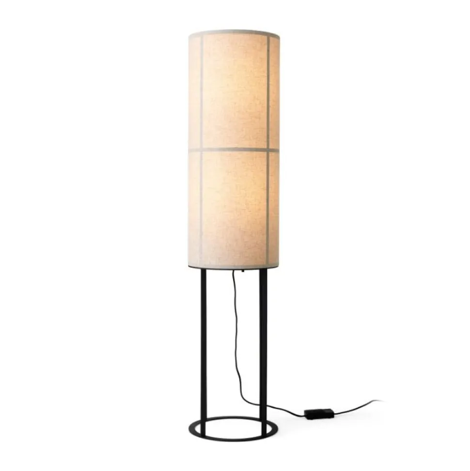 Hashira-serien med de slanke cylindriske lamper gennemskinnelige stof, som på japanske lanterner og persienner, spreder blødt lyset i flere retninger. Gulvlampen er sat på en stålbase, som understøtter det minimalistiske udtryk.