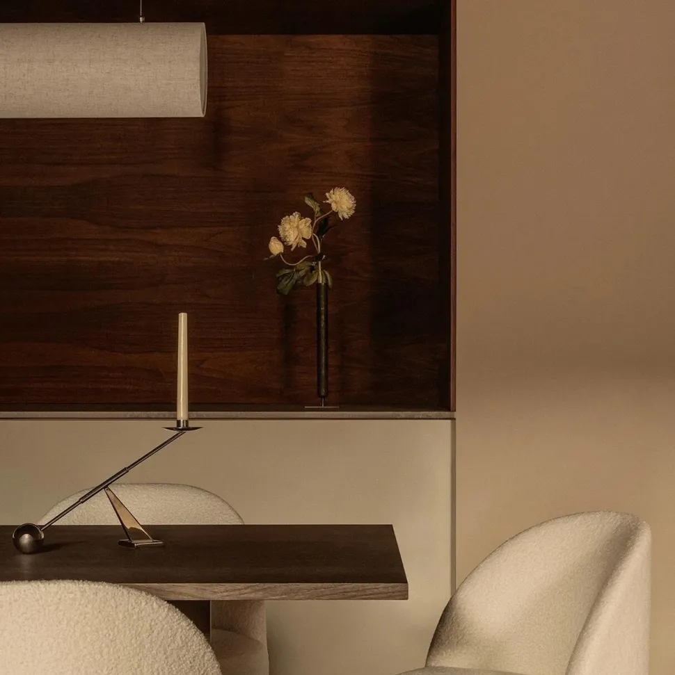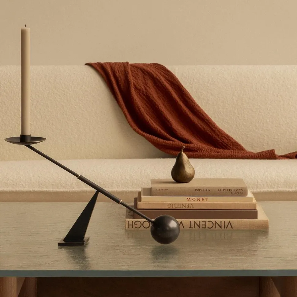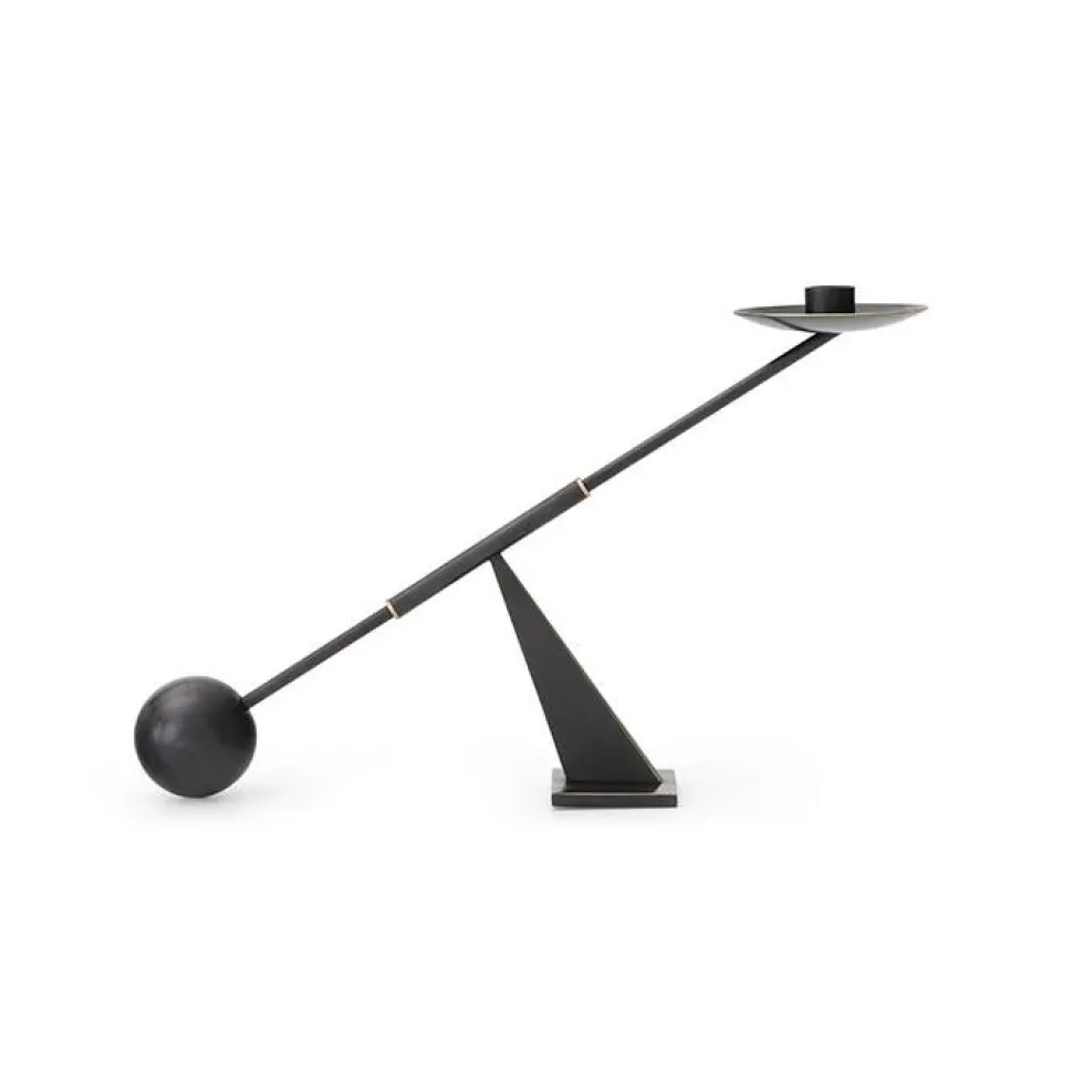 Minimalistisk og stilfuld lysestage, der fungerer som et lysende midtpunkt med overdrevne proportioner. Designet er enkelt og geometrisk, idet en kugle, en vinkel og en linje forenes og skaber et unikt designobjekt. Lysestagen er designet af Colin King, der intenderede at skabe en interiørobjekt, der tilmed fungerer som en skulptur.