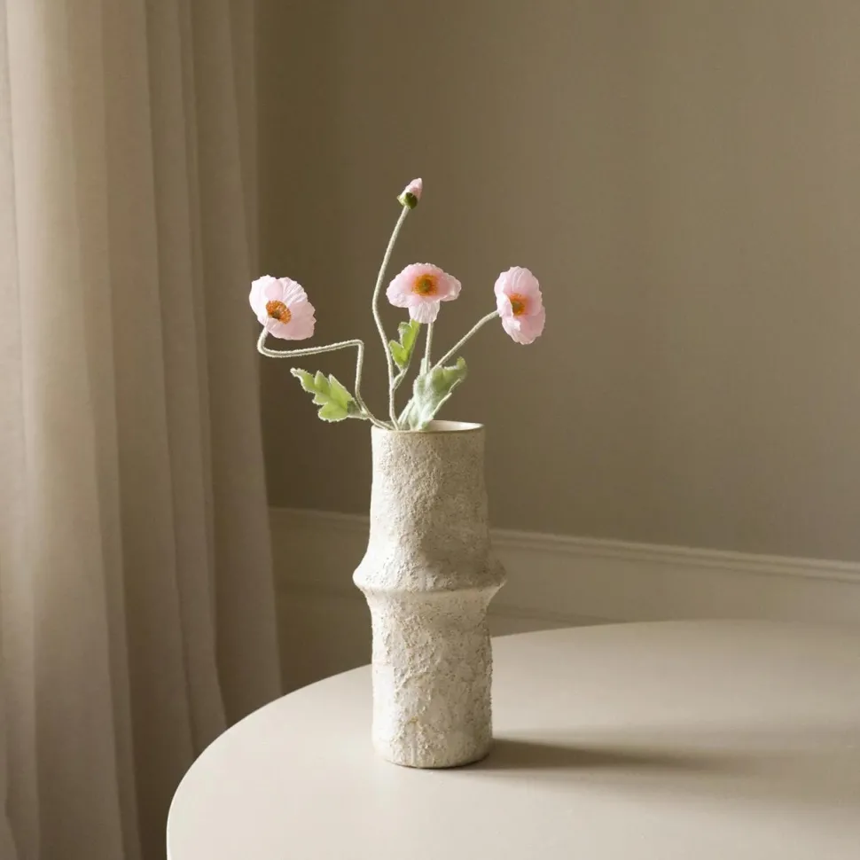 Yndefuld valmueblomst, der skaber en blid og romantisk stemning i hjemmet. Blomsterhovedernes fine, krøllede kronblade i sarte rosa farvenuancer omfavner på fineste vis de livlige, gule midter og giver et frisk og forårsagtigt udtryk. De mange forgrenede stilke giver fylde og dybde, mens de detaljerede, grønne blade tilføjer en autentisk finish. De slanke, fløjlsbløde stilke står elegant og har et naturtro udseende. En tidløs blomst, der bringer mildhed, varme og stil til ethvert rum.