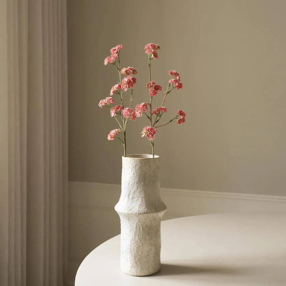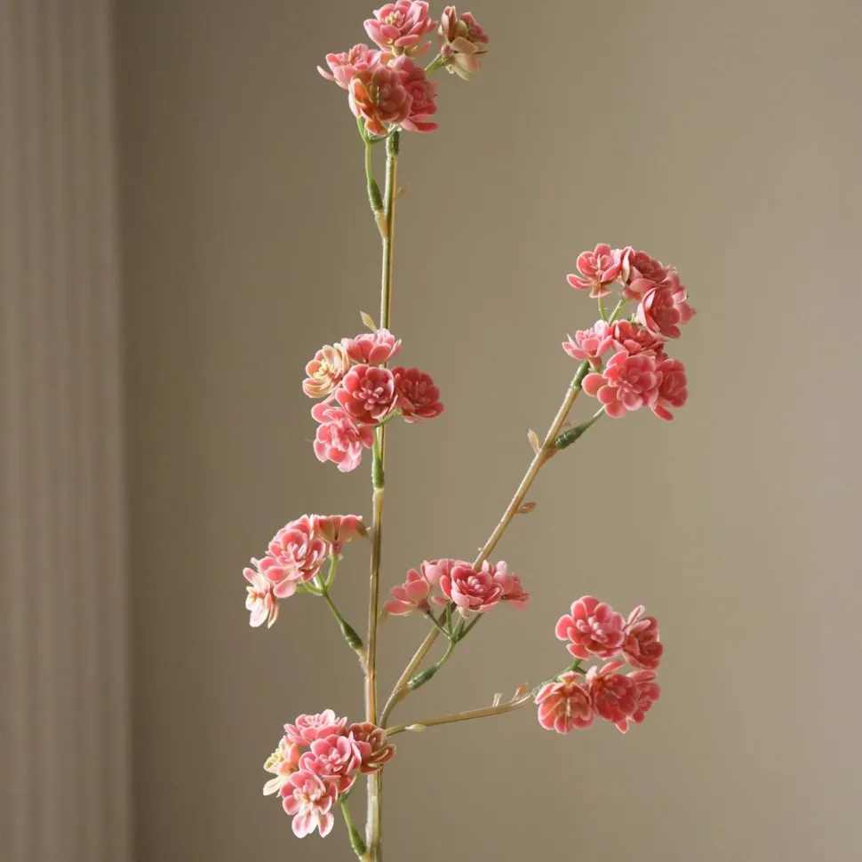 En moderne klassiker med naturlig finesse. Grenen består af flere kompakte blomsterklynger med små, lagdelte kronblade i bløde rosa nuancer med fine strejf af fersken. De tætte, næsten rosetformede blomster giver et balanceret og skulpturelt udtryk. Stilkene forgrener sig elegant og hviler på en hovedstilk, der gradvist skifter farve fra grøn til lys brun – en detaljerig finish, der forstærker det naturtro udtryk. Grenen er ideel til at skabe struktur og ro i ethvert arrangement – minimalistisk, men levende i sit formsprog.