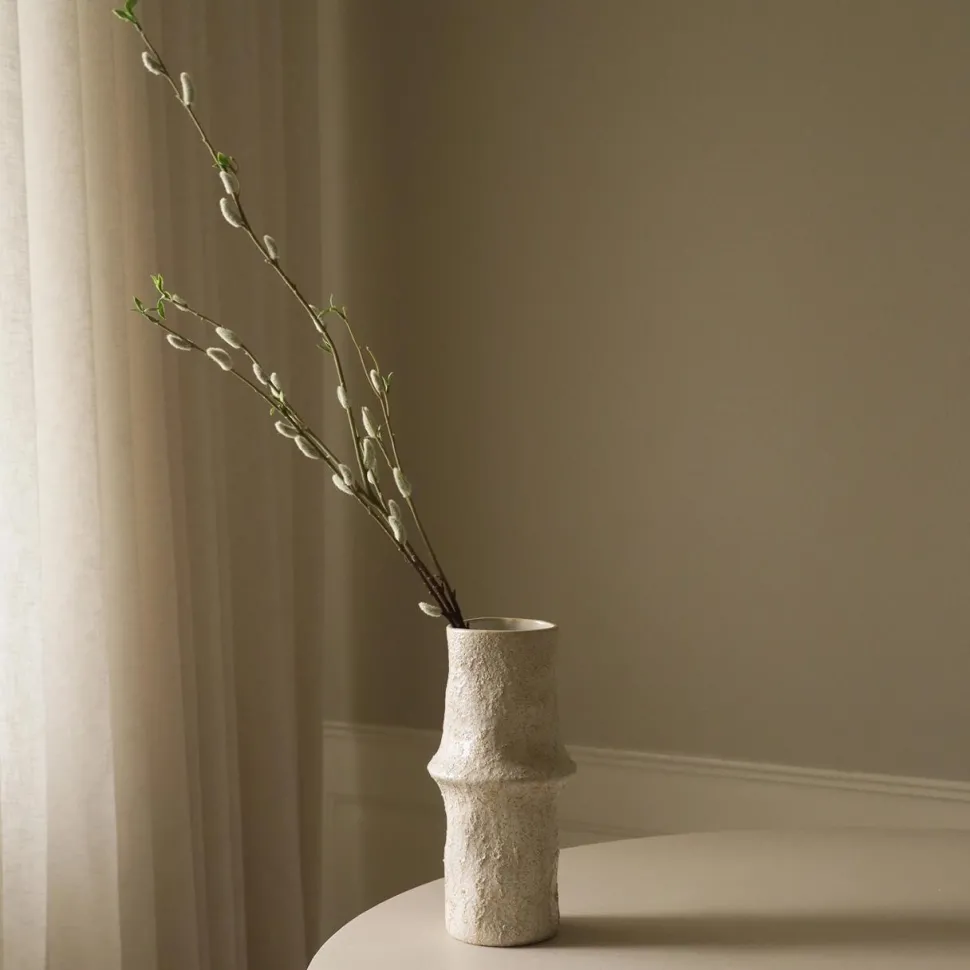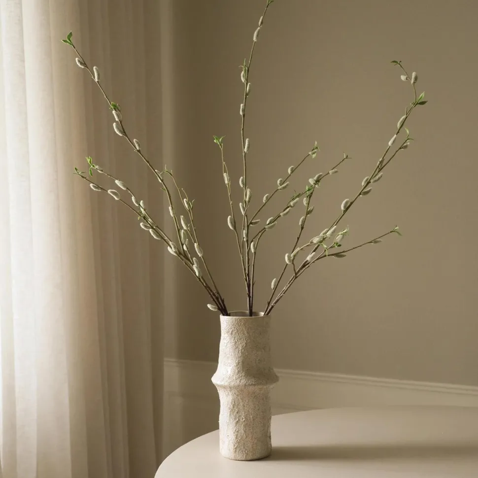 Fin bladstængel, der tilføjer højde og struktur til blomsterarrangementer. Grenen har flere bløde, teksturerede knopper i dæmpede, hvide toner på naturlige brune stængler med små, grønne blade. Det detaljerede design minder om friske pilegrene. Grenen er designet til at være alsidig, hvorfor stilken kan bøjes og formes efter eget ønske.