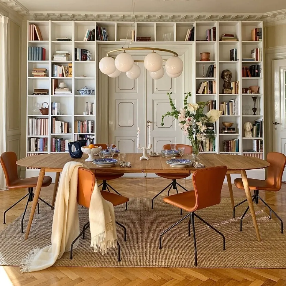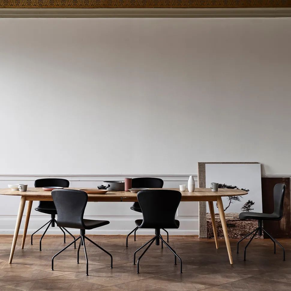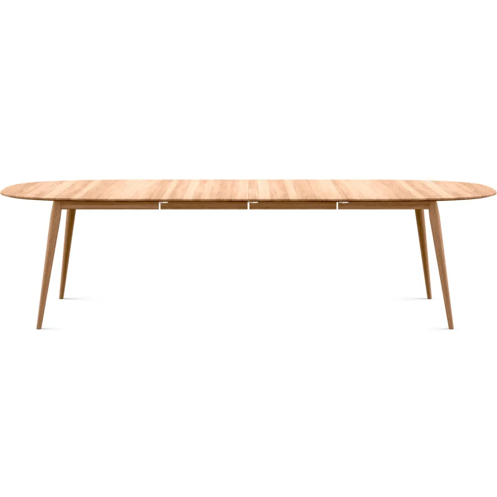 Enkelt og stilfuldt spisebord, hvis bløde kurver, robuste materialer og danske håndværk sikrer et tidløst design, som kun bliver smukkere med tiden. Bordet kan rumme alt fra en simpel familiemiddag til store middagsfester, idet der medfølger to tillægsplader i massivt egetræ, som elegant og kan opbevares inde i bordet.