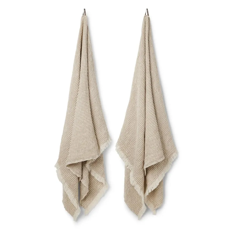 Stilfuldt og farvefint håndklæde, der balancerer mellem funktionalitet og elegance. Håndklædet er en skøn kombination af bomuld og hør, hvilket resulterer i en formidabel tørreevne og en skøn, luksuriøs blødhed. Qua vaffelstrukturen og garment-wash behandlingen bringer håndklædet et afslappet, men sofistikeret spa-udtryk, som både er stilfuldt og skønt.