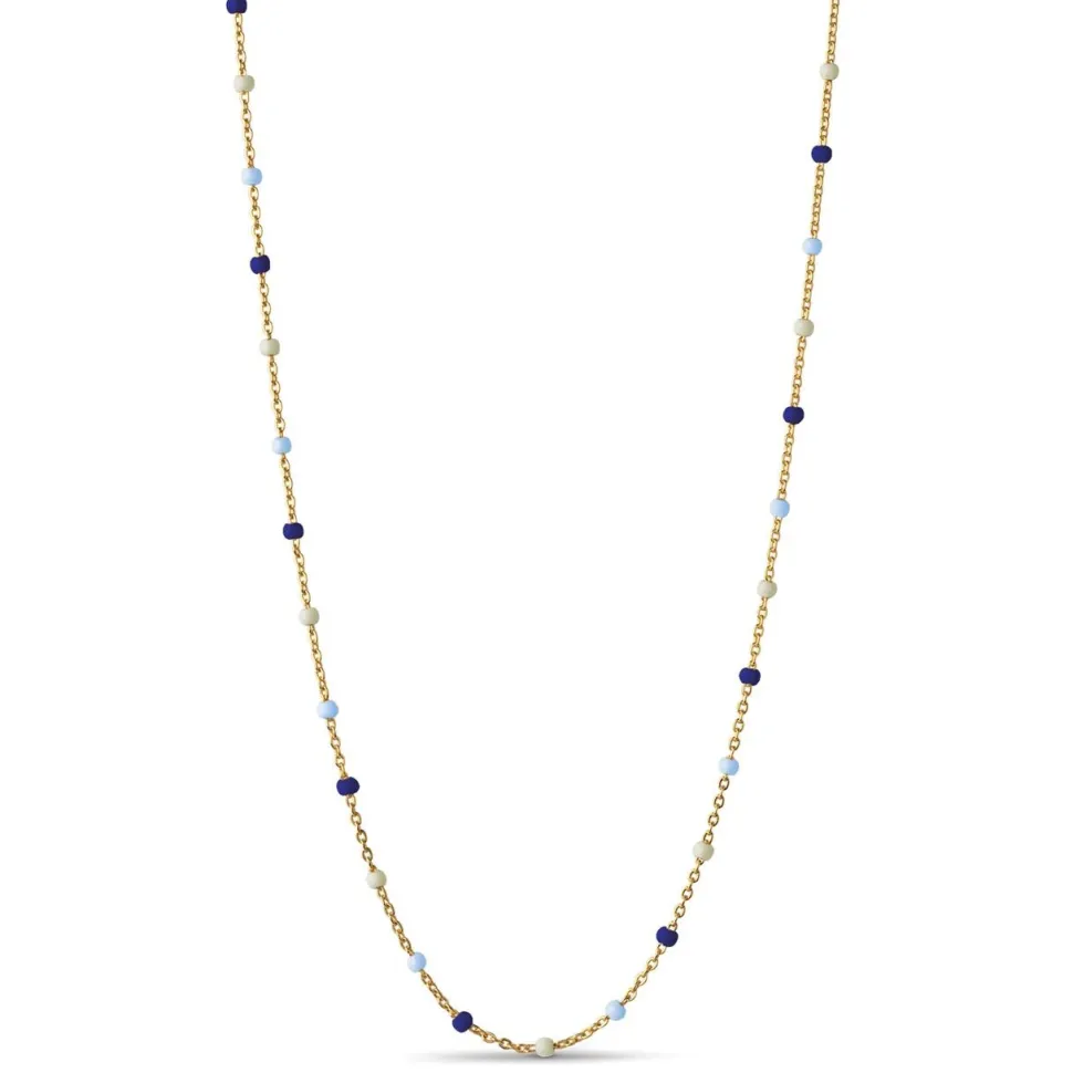 Enkel og farvefin halskæde med små emaljer. Emaljeperlerne har forskellige nuancer af blå og beige langs kæden. Halskæden kan tages på alene eller kombineres med andre halskæder.