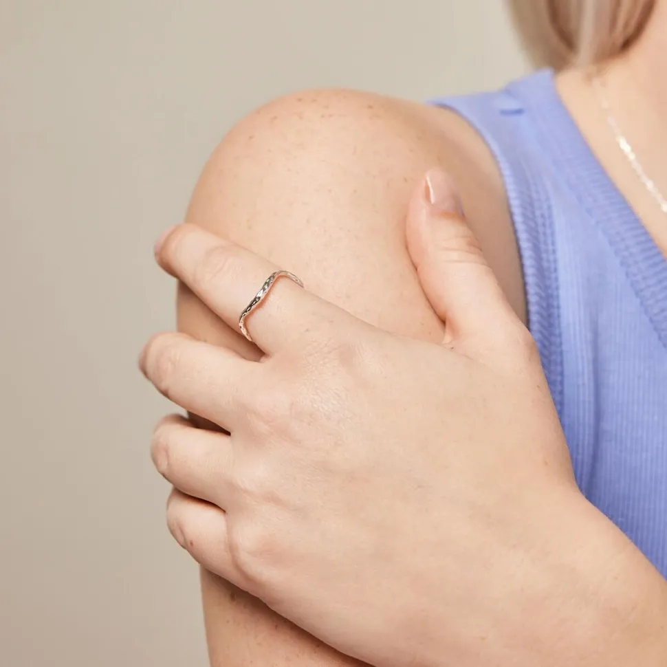 Enkel ring i et legende udtryk og elegant design. Ringen tilfører et subtilt og skinnende raffinement, idet sølv udstråler modernitet, enkelhed og tidløs skønhed. Sølv tilføjer et sofistikeret udtryk til ethvert look og kan let tilpasses enhver stil. Uanset om ønsket er at udtrykke en minimalistisk æstetik eller skabe kontrast med andre farver, vil ringen tilføje en subtil glans til hånden.