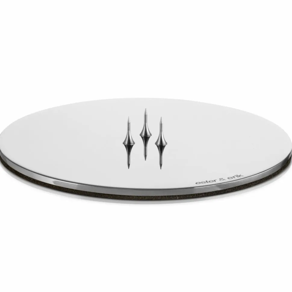 Rund platte, som er fremstillet i et enkelt og stilfuldt design, der står flot til alle de håndlavede lys fra Ester & Erik. Platten benyttes særligt i kombination med kegle- og bloklys. Lyset fastholdes på platten af tre stifte i bunden, hvorved alle lys kan stå stabilt. Desuden er der tilført skum på bagsiden af platten for herved at skåne underlaget. Som overfladebehandling er der anvendt PVD, hvilket er en ny miljøvenlig måde at coate metaller på, som samtidig giver en suveræn kvalitet og finish.