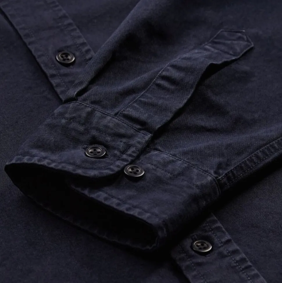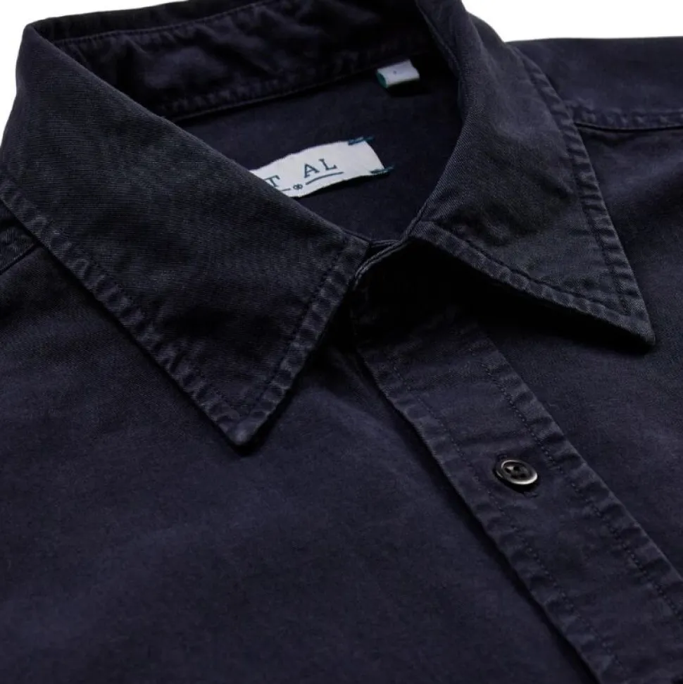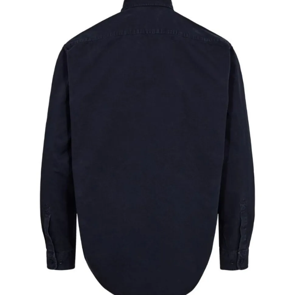 Den klassiske skjortekrave og de lange ærmer med manchetter giver et tidløst udtryk, mens den åbne brystlomme og knaplukningen foran tilføjer praktiske detaljer. Skjorten kommer i en dyb mørkeblå farve, der nemt kan styles op eller ned alt efter dit behov.