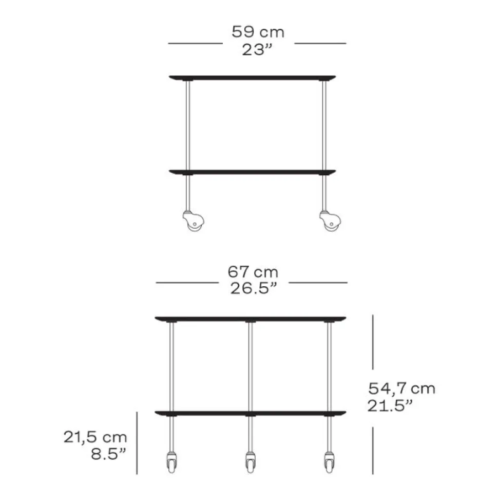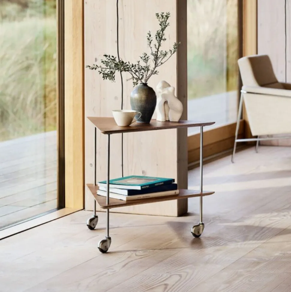 Barvogn, rullebord eller sidebord i rustfrit stål. Et mobilt og alsidigt design med et sofistikeret, arkitektonisk input. Arne Jacobsen designede oprindeligt møblet, så han på den mest elegante vis kunne nyde sin te. Bordet har gennem årene bevaret sit moderne udtryk og er brugbart såvel som alsidigt. Bordet fås med plader i valnød eller sortfarvet ask.