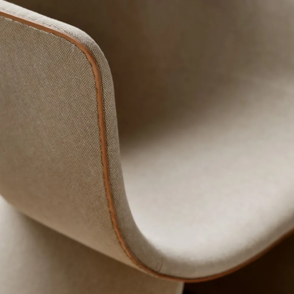 Stolen kan tilpasses med en kombination af én eller to tekstiler i dine foretrukne farver og materialer, så den passer perfekt ind i ethvert interiør. En elegant læderpiping understreger stolens slanke silhuet og tilføjer et sofistikeret touch, der fuldender enhver indretning med stil.