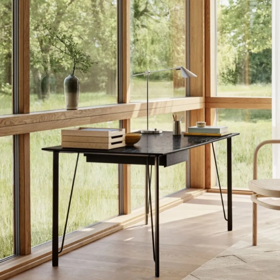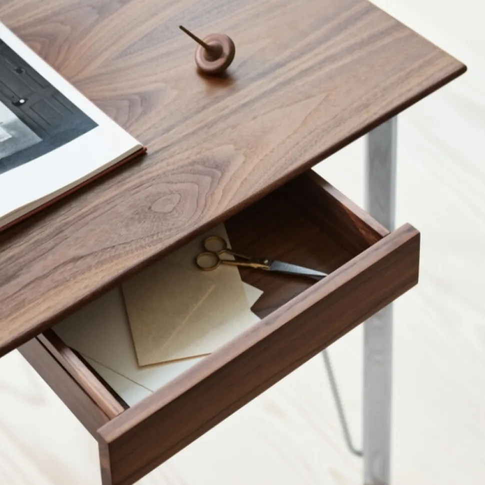 Bordpladen fås i eksklusiv valnødfinér eller farvet askefinér og hviler på slanke ben i enten blankt forkromet- eller pulverlakeret stål, som giver et let og moderne udtryk. Designet kan tilpasses med en integreret skuffe, som tilføjer både funktionalitet og varme til udtrykket.