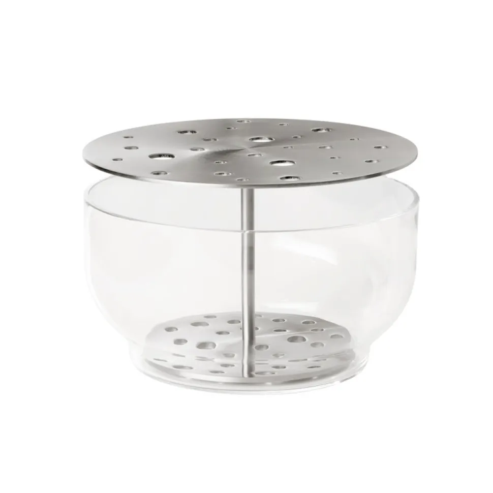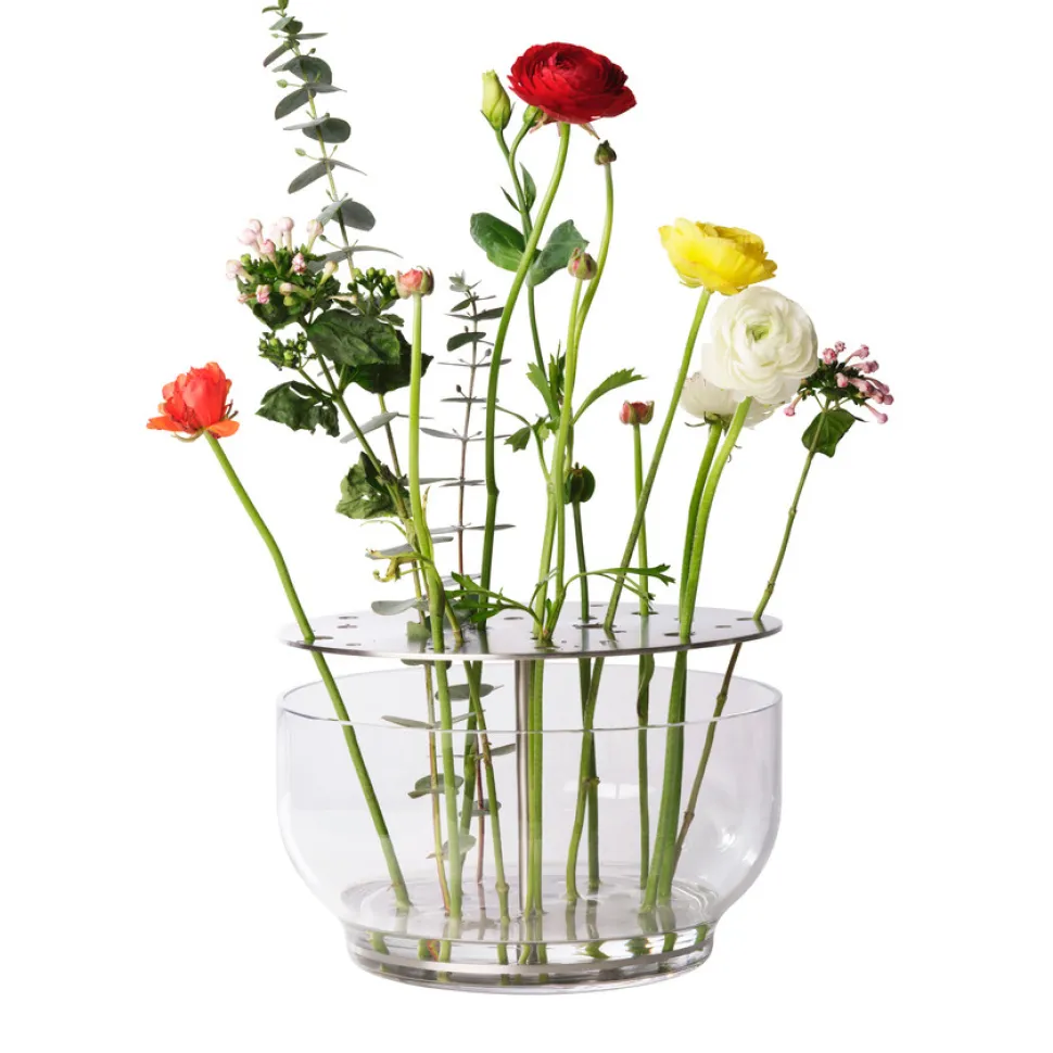 Smukt og elegant vase, der på fineste vis pryder i boligindretningen. Vasen er designet i ånden af Japans ikebana-tradition for blomsterarrangementer og en længsel efter skønhed. Vasen er skabt for at ære hver enkelt blomst, der placeres heri – fra stilk til blomsterhoved. Den tidløse vase er lavet af mundblæst glas og en fritstående struktur i rustfrit stål, som holder blomsterne.