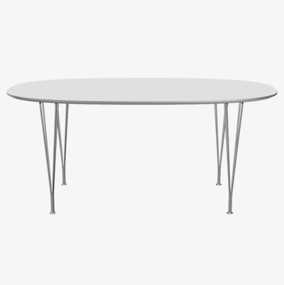 Super-Ellipse bordet har en plade i enten laminat eller valnød og spændben i forskellige udgaver. I Fenix laminat er bordpladen med nano-tech overflade, der ikke ændrer farve over tid, er hygiejnisk og varmeresistent samt anti-fingeraftryk. Bordpladen har en matpoleret aluminiumskant, der gør bordet ekstra slidstærkt.