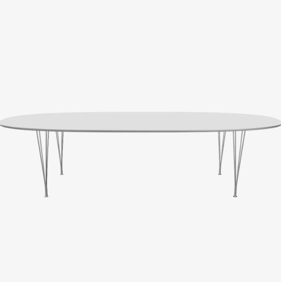 Super-Ellipse bordet har en plade i enten laminat eller valnød og spændben i forskellige udgaver. I Fenix laminat er bordpladen med nano-tech overflade, der ikke ændrer farve over tid, er hygiejnisk og varmeresistent samt anti-fingeraftryk. Bordpladen har en matpoleret aluminiumskant, der gør bordet ekstra slidstærkt.