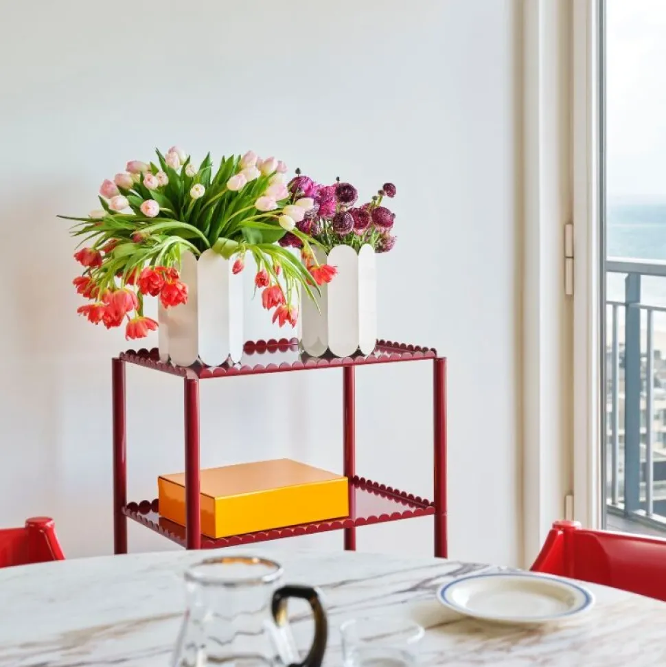 Arcs Trolley er designet af den belgiske duo Muller Van Severen og er en funktionel og dekorativ trolley indkapslet i en samlet kæde af lodrette buer. Den elegante, udformede ramme understøtter to eller tre etager med slanke ben monteret på hjul for nem manøvrering.