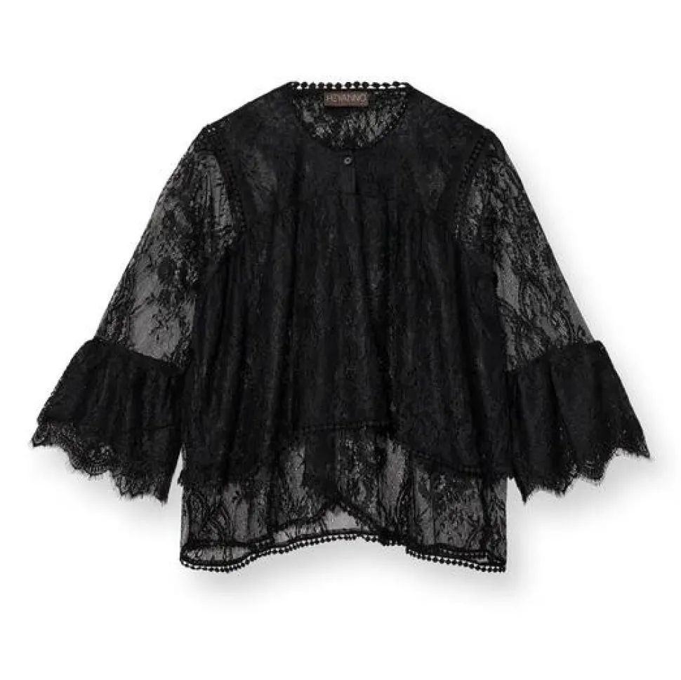 Feminin lethed med moderne kant. Blondeblusen er designet med en høj, rund hals og elegante bølgede manchetter, der tilfører subtile, sofistikerede detaljer. Den lette blondekvalitet har en diskret tekstur, som giver et eksklusivt præg og et elegant udtryk. Resultatet er et feminint design med en cool, underspillet karakter, der gør blusen til en alsidig favorit – lige velegnet til lag-på-lag styling som til et rent, minimalistisk look.