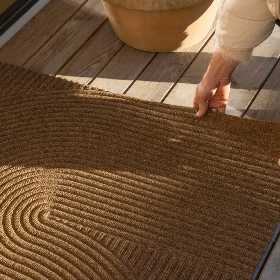 Stilfuld, smudsfangende og absorberende måtte, der er inspireret af japanske Zen-haver. Dørmåttten er udført i en dæmpet jordlig nuance, der matcher måttens navn. Det tredimensionelle mønster er både taktilt og meditativt, hvilket skaber en rolig atmosfære lige uden for døren. Måtten er designet med en ru overflade og en gummieret bagside, hvorfor den er velegnet til både inden- og udendørs brug.