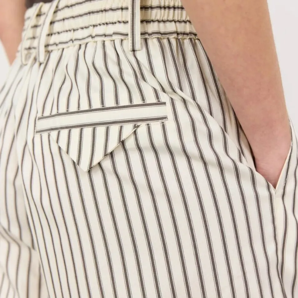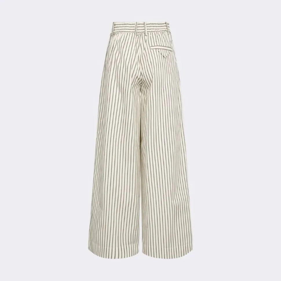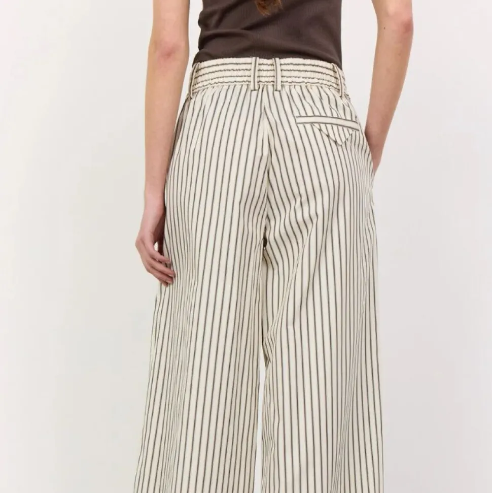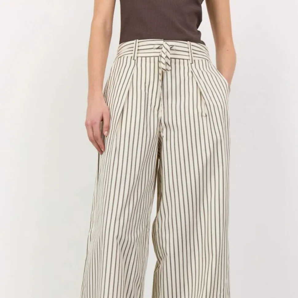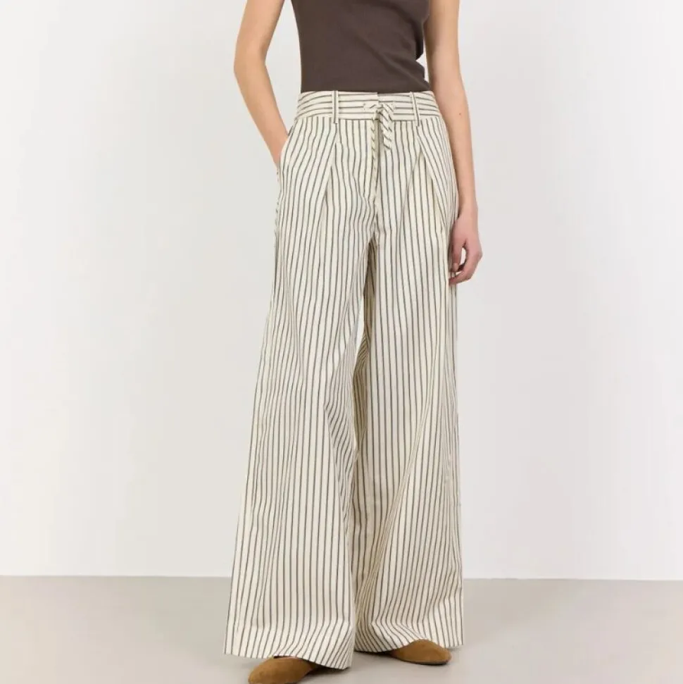 Bukserne har et elegant nålestribet mønster, læg foran og et bredbenet snit, som giver en flatterende og luftig silhuet. Den elastiske talje med justerbar snøre sikrer en god pasform og gør dem velegnede til både hverdagsbrug og mere formelle sammenhænge.