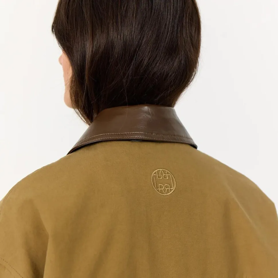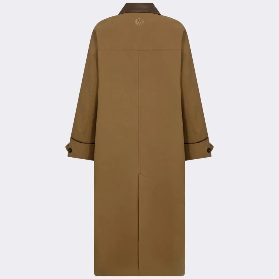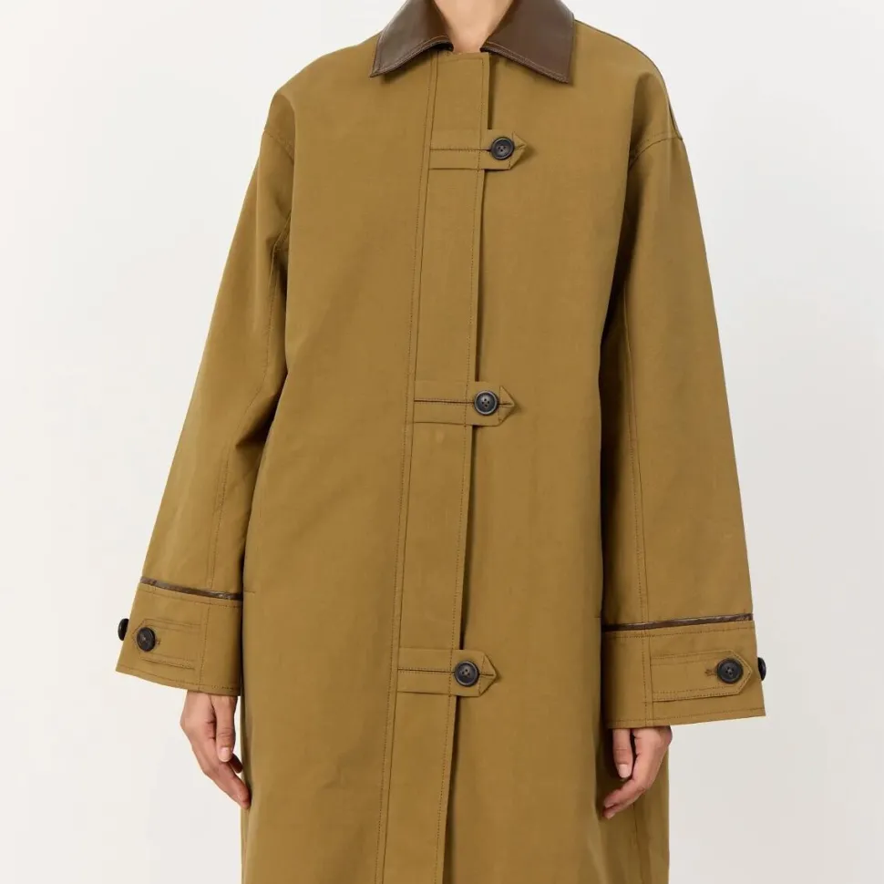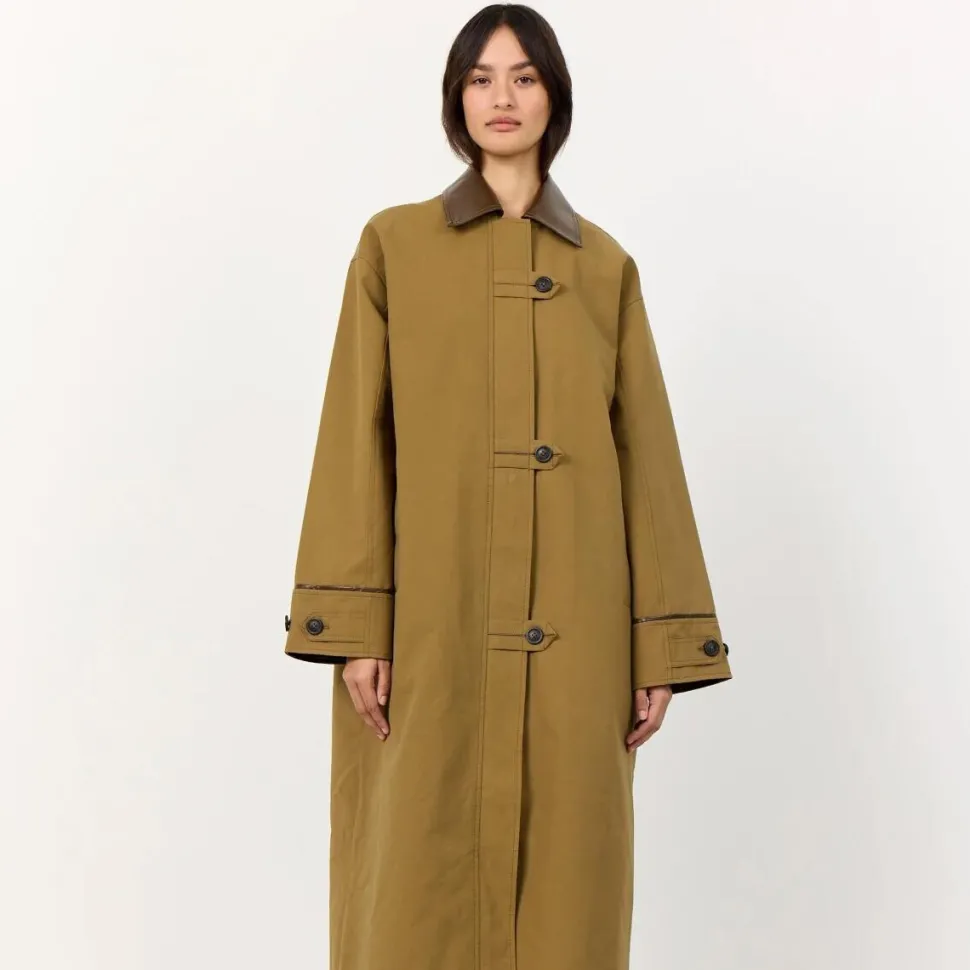 Tidløs frakke, der kombinerer klassisk elegance med moderne detaljer. Frakken præsenterer et sofistikeret, minimalistisk design, hvor den eksklusive læderkrave og diskrete knaplukning tilfører et subtilt luksuriøst touch. De lange ærmer og den velafbalancerede silhuet gør frakken alsidig og let at style – både til hverdag og mere formelle lejligheder.