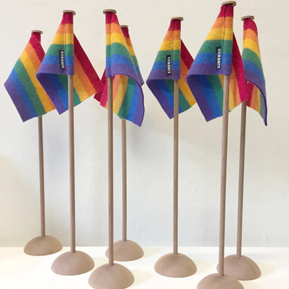 Skab en festlig og farverig atmosfære til din næste fest eller begivenhed med vores Linedyr bordflag med regnbue. Det fine bordflag er lavet i naturlige materialer og vil med sikkerhed pynte på fødselsdagsbordet. Flaget er strikket i 100% merinould, mens fod og pind er i mahogni, og knoppen er i kernelæder.