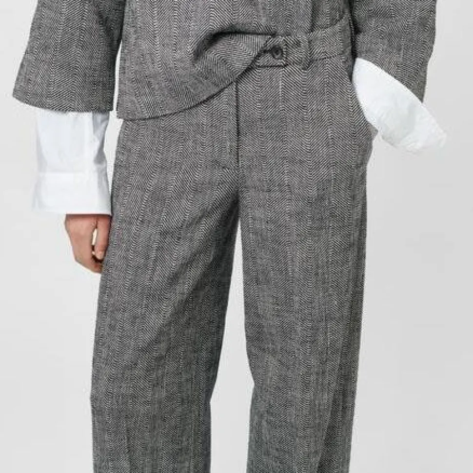 Klassiske bukser, der løfter enhver garderobe med både elegance og komfort. Bukserne er fremstillet i en luksuriøs bomuld/polyester-kvalitet, der sikrer et let og behageligt fit. Med en mellemhøj talje, skrålommer og vidde i benene opnås en fin silhuet, mens den asymmetriske lukning foran tilføjer et moderne touch. Qua det afslappede, men elegante udtryk er bukserne et must-have, idet de kan styles til både hverdag og festlige begivenheder.