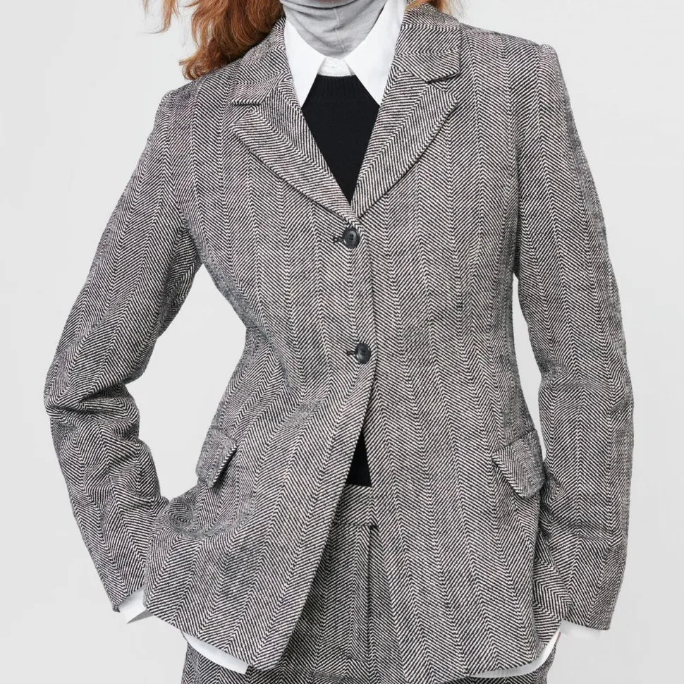 Sofistikeret blazer med en taljeret pasform, der smukt fremhæver figuren. Den enkle knaplukning og de praktiske lommer tilføjer både funktionalitet og et klassisk design, mens slidsen bagpå giver bevægelsesfrihed og et stilfuldt touch. Det elegante herringbone mønster skaber et raffineret udtryk, hvorfor blazeren er et must-have i garderoben.