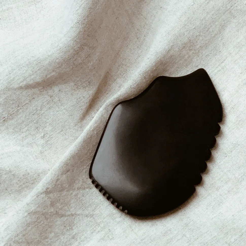 Denne gua sha er lavet i bian sten, hvilket er den originale natursten kineserne har brugt i mere end 2500 år. Stenen har mange gode kvaliteter, idet den blandt andet indeholder mere end 40 mineraler, der kan virke beroligende for kroppen og forebygge pigmentforandringer.