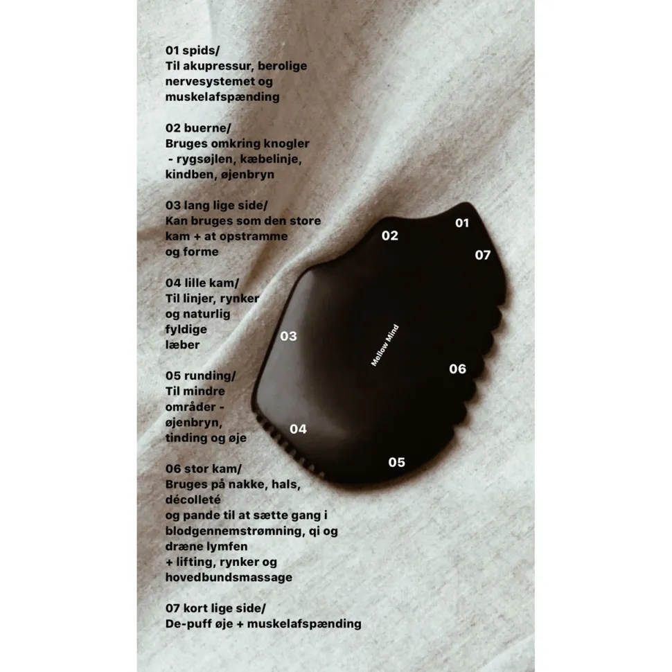 Gua Sha er et beroligende self-care ritual, hvor man arbejder holistisk for at skabe de bedste rammer for ens hud ved at udføre en massage af ansigtet, hals og nakke. Ved regelmæssig udførelse stimuleres lymfekirtlerne, blodgennemstrømningen øges, huden opstrammes og tilfører den smukkeste glød.