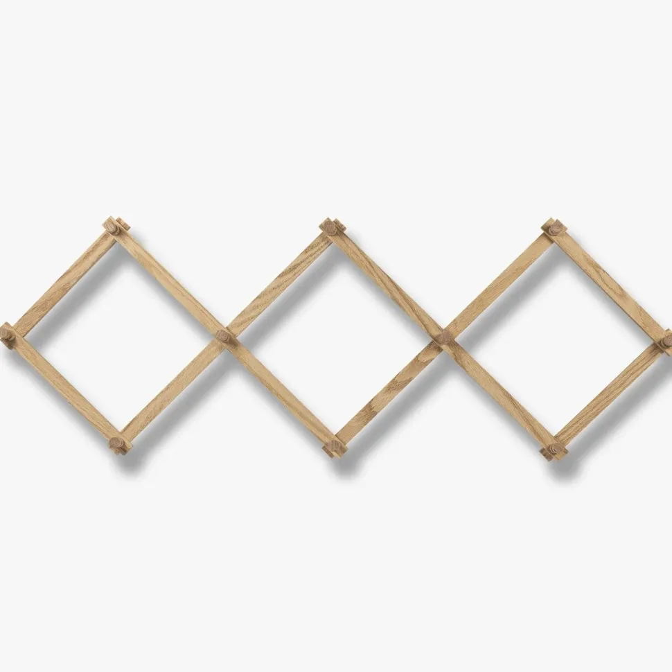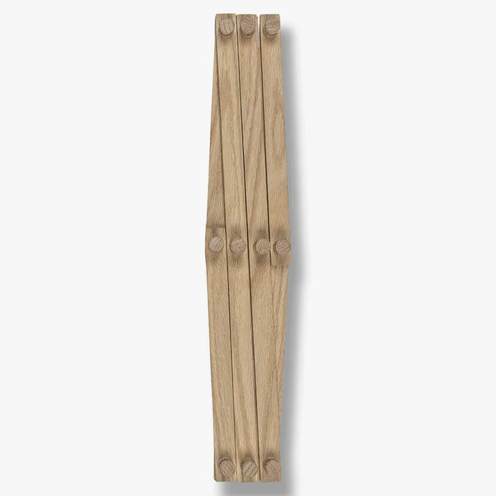 Enkel og tidløs knagerække, der er skabt til både at være et æstetisk og praktisk element i indretningen. Den traditionelle sakseknage har fået en moderne opdatering og er fremstillet i egetræ. Den massive egetræskonstruktion sikrer, at hver knagerække er unik med variationer i farve, knuder og årer.