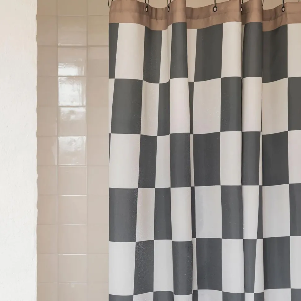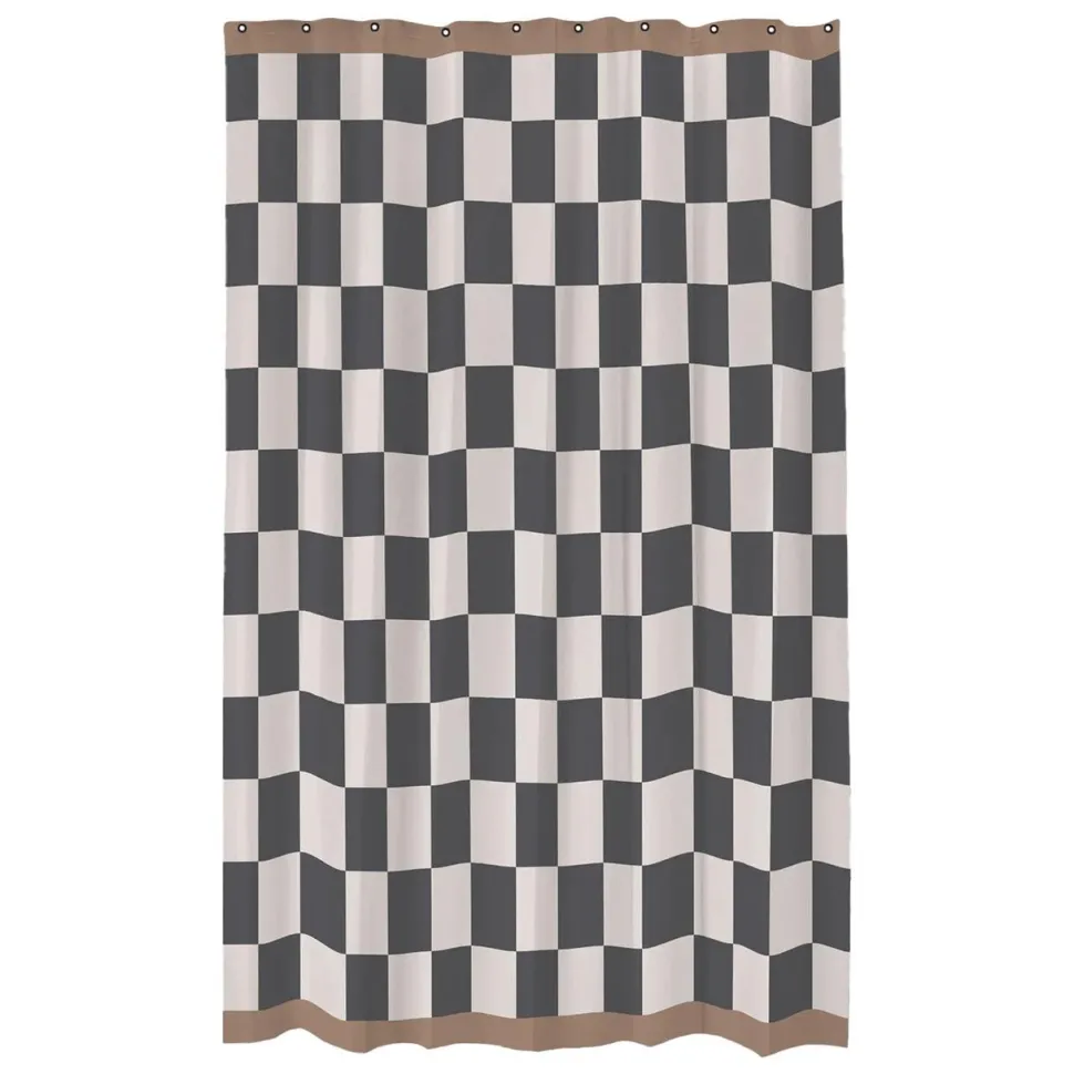 Indret badeværelset med badeforhænget, hvor klassisk design møder moderne funktionalitet. Badeforhænget er designet med et iøjenfaldende, retro-inspireret grafisk mønster i kontrastfyldte tern, som på fineste vis indrammes af en lysebrun bort – både i toppen og bunden. Heri er der placeret sorte metalringe, som både fuldender udtrykket og sikrer nem ophængning. Badeforhænget er skimmel- og vandafvisende, hvorfor det i al sin enkelthed er en stillfuld og praktisk løsning.