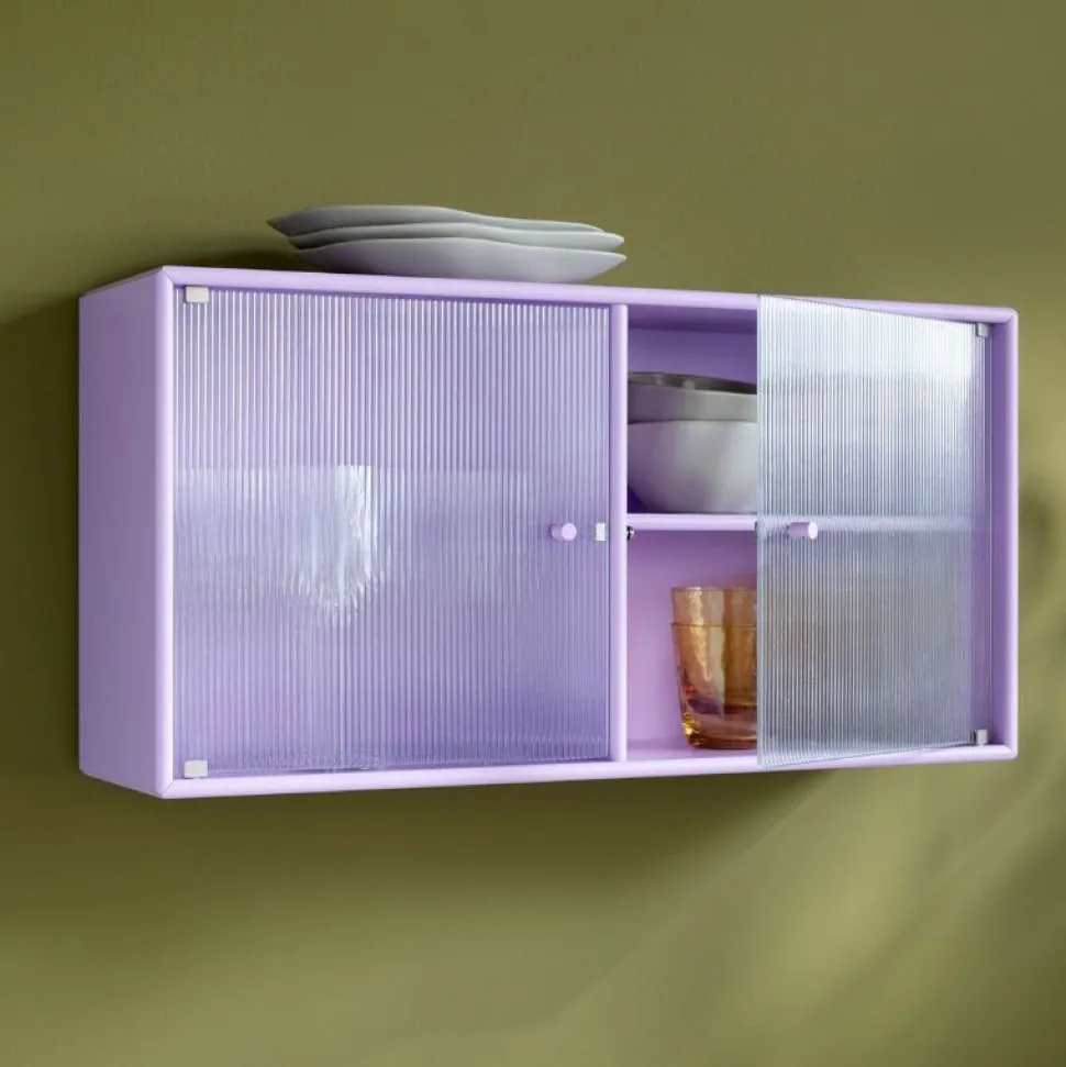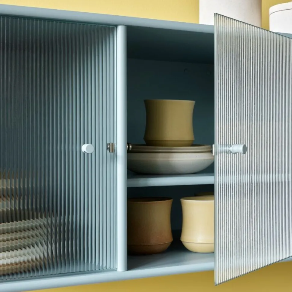 RIPPLE I er et væghængt vitrineskab med 2 låger i riflet glas. Skabet kan bruges som overskab i køkkenet, som et dekorativt skab i stuen eller spisestuen. RIPPLE I har 1 flytbar hylde med bærere, som gør det let at arrangere og omarrangere hylden efter behov. Grebene er pulverlakerede i samme farve som skabet.