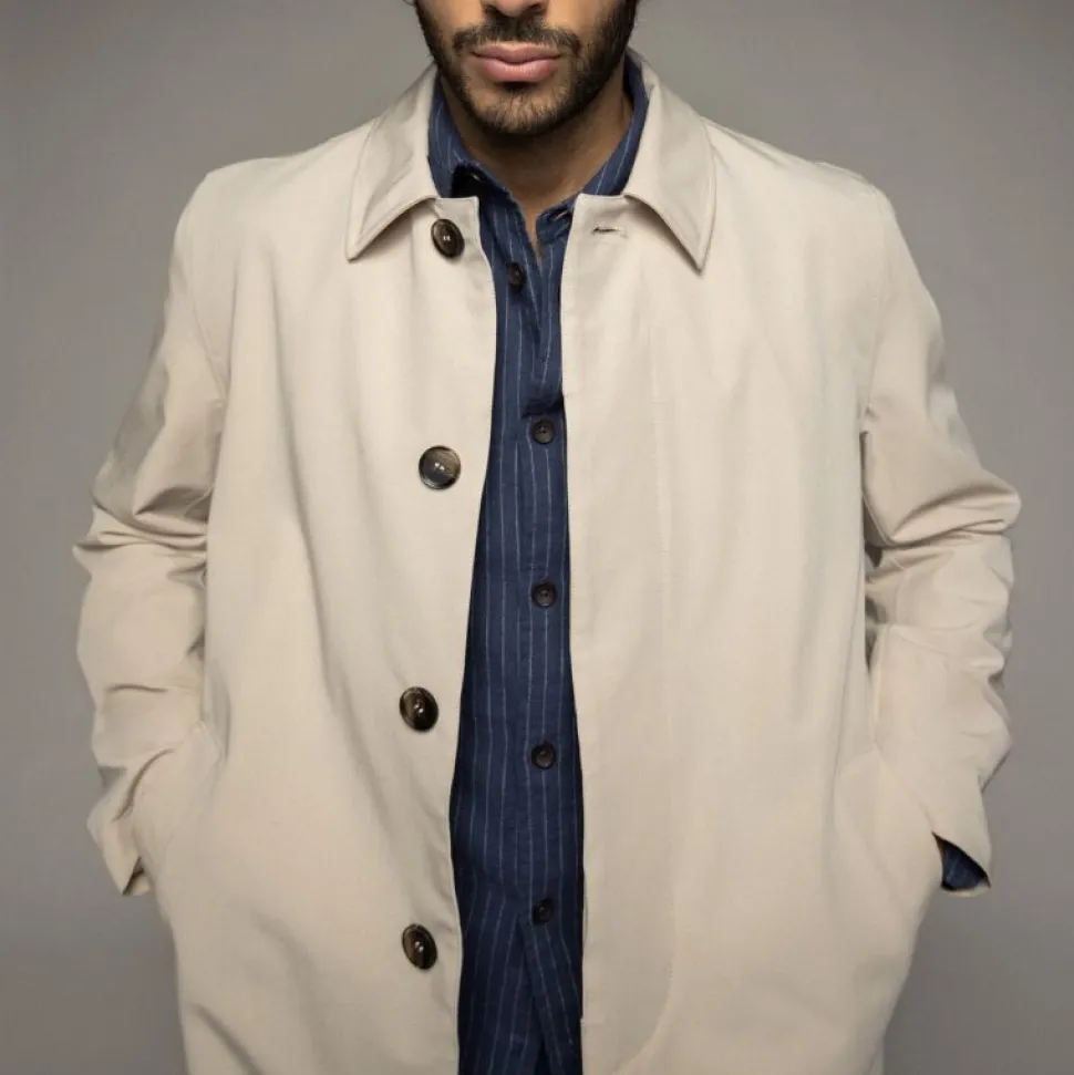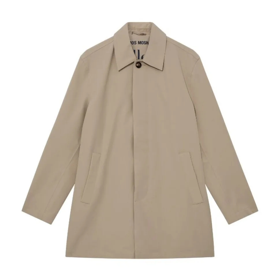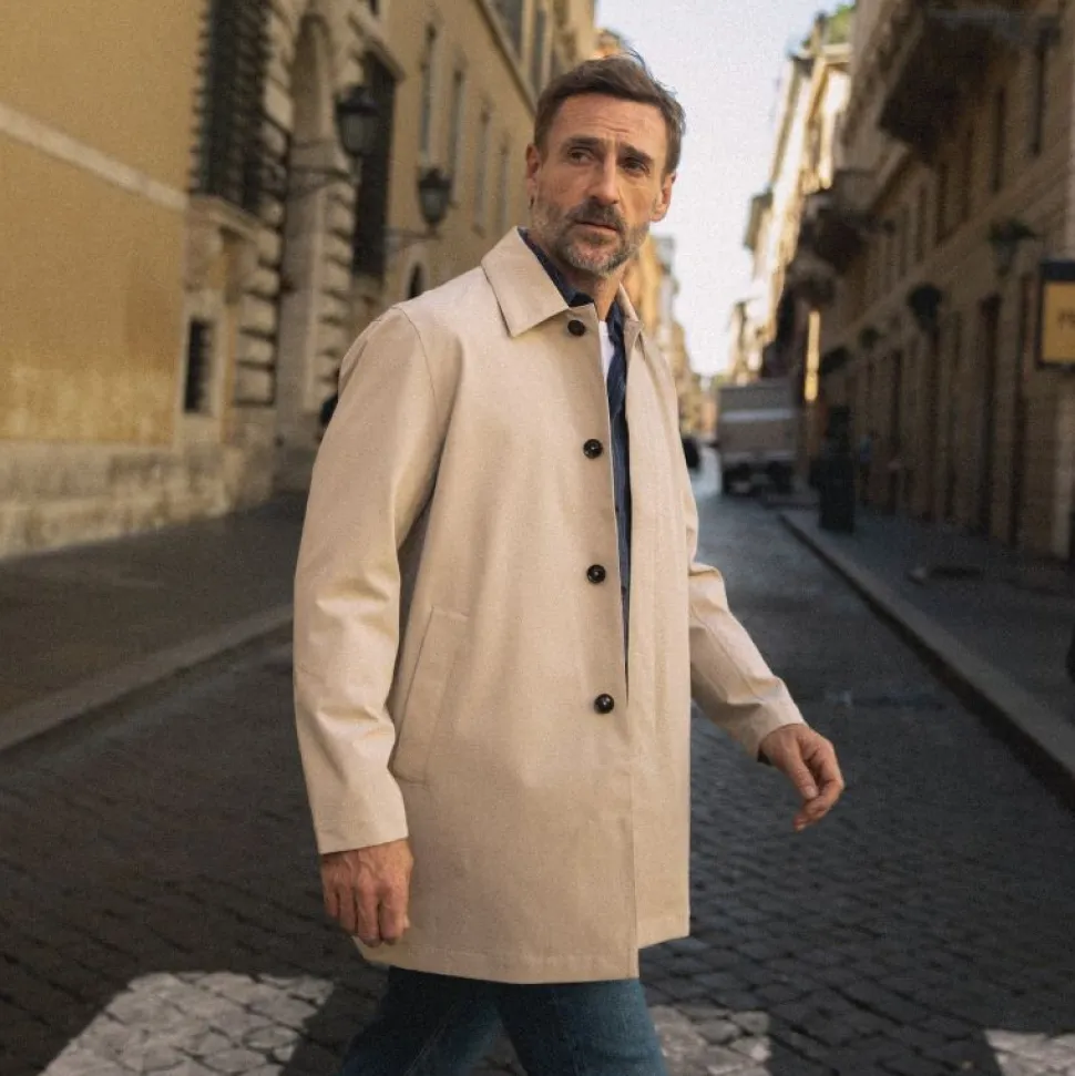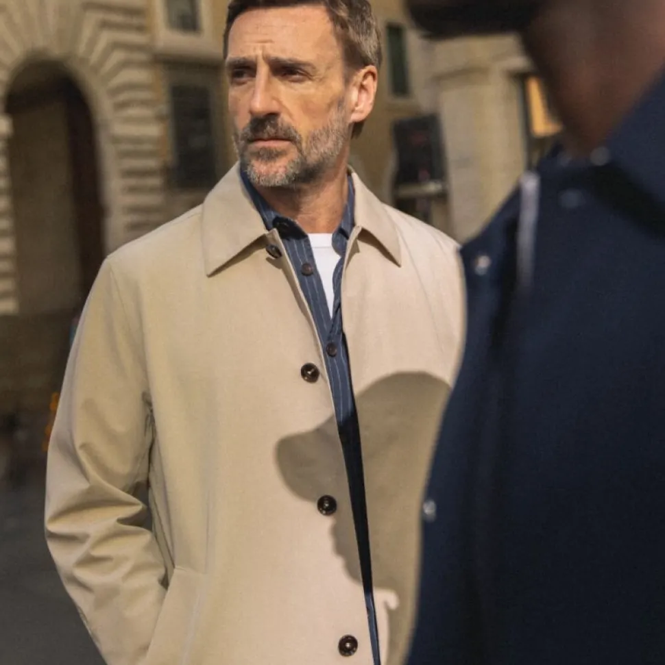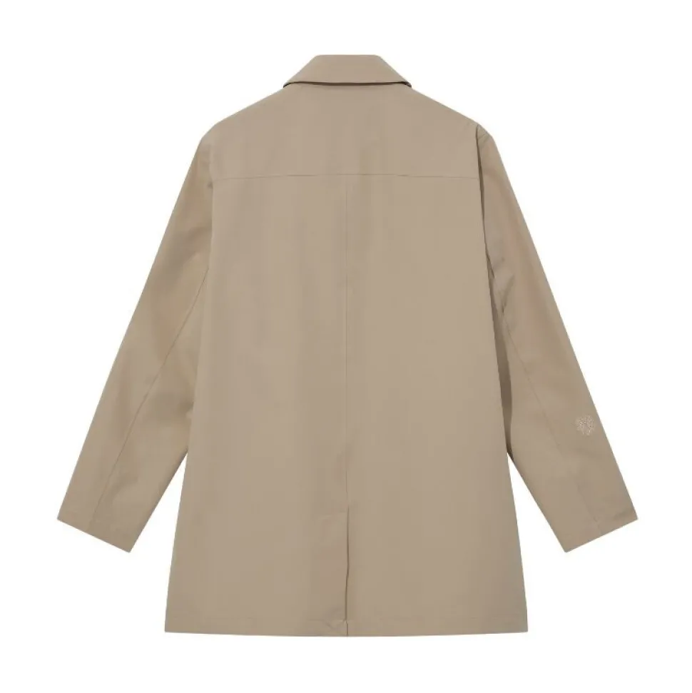 Denne elegante frakke er designet med en lige silhuet, skjult lukning og en klassisk spids krave. Ærmerne er detaljeret med diskrete stropper, der tilføjer et raffineret touch. Frakken har et tidløst og alsidigt udtryk, som gør den nem at kombinere med resten af din garderobe – uanset om det er til hverdag eller mere formelle anledninger.