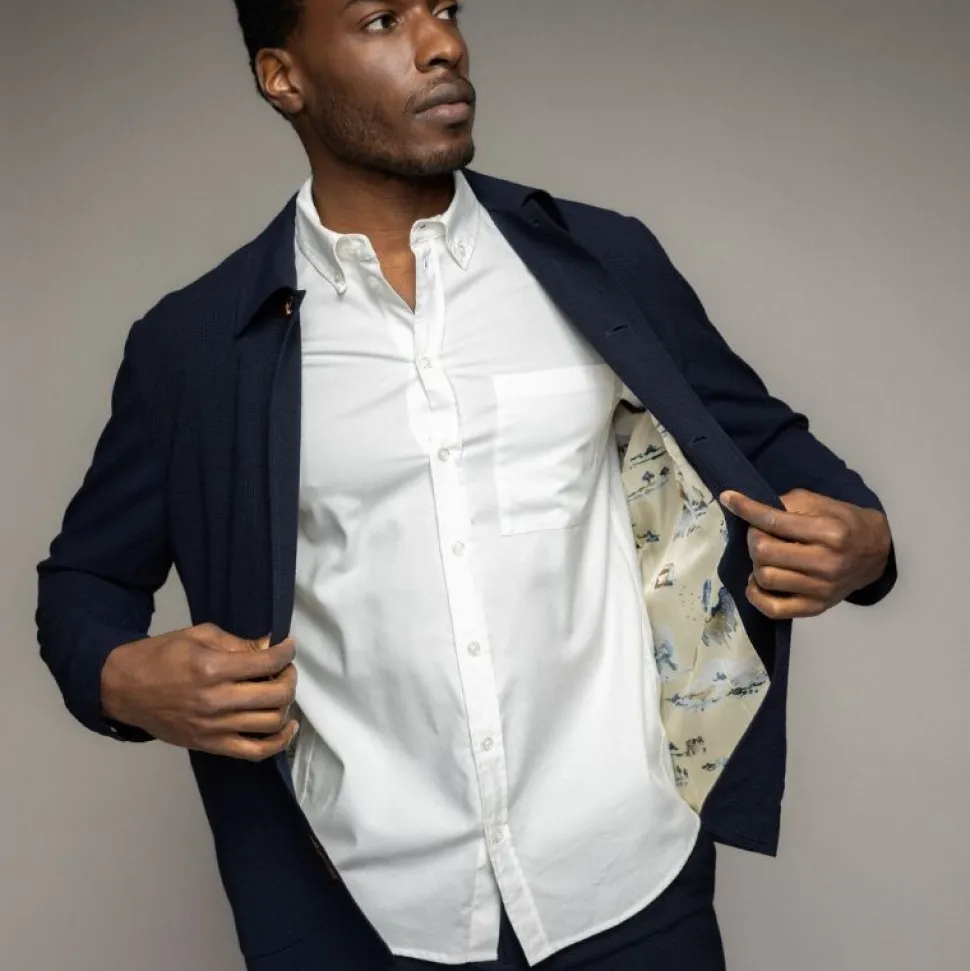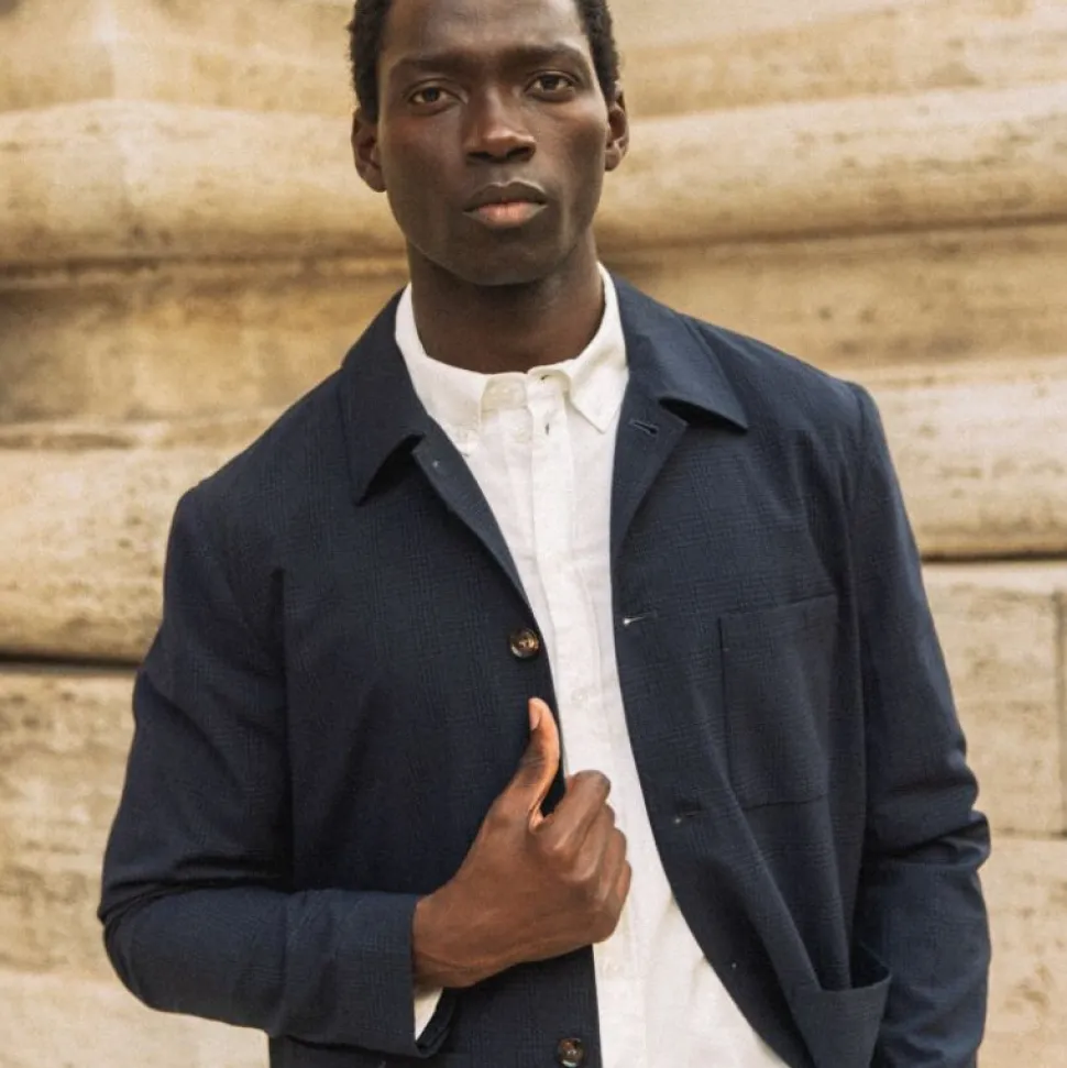 Denne ternede seersucker-jakke er et stærkt bud på en moderne forårsjakke til herregarderoben. Med sin strukturerede overflade og workwear-inspirerede detaljer forener den funktion og stil på elegant vis. Jakken har en regulær pasform og er udstyret med flere praktiske frontlommer.