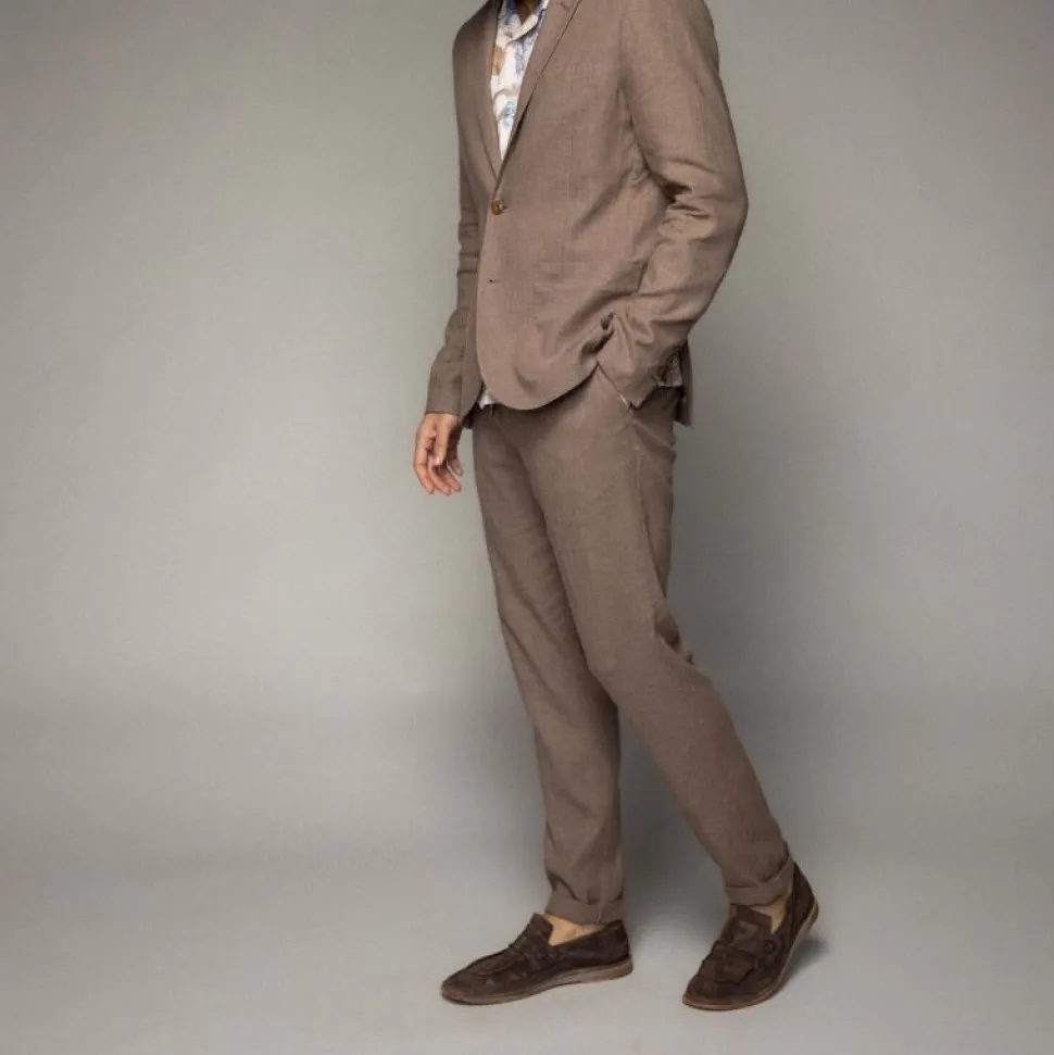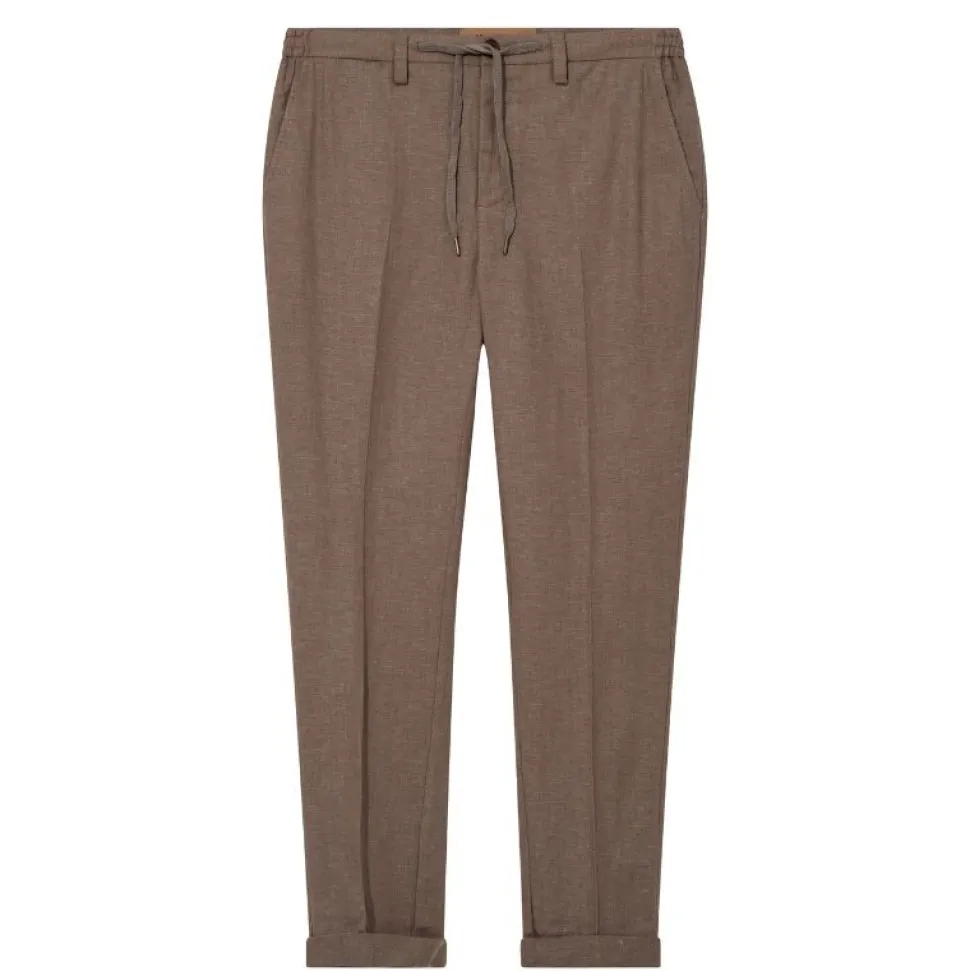 Disse lette hørbukser er en sommerfavorit, du ikke vil undvære. De er fremstillet i en luftig blanding af hør og viskose og har en regulær pasform med midt talje. Den elastiske linning med justerbare snører sikrer en behagelig og fleksibel pasform. Brug dem med en enkel T-shirt for et afslappet udtryk, eller kombinér dem med den matchende hørblazer for et mere gennemført og stilrent look. Et must-have i enhver moderne herregarderobe.