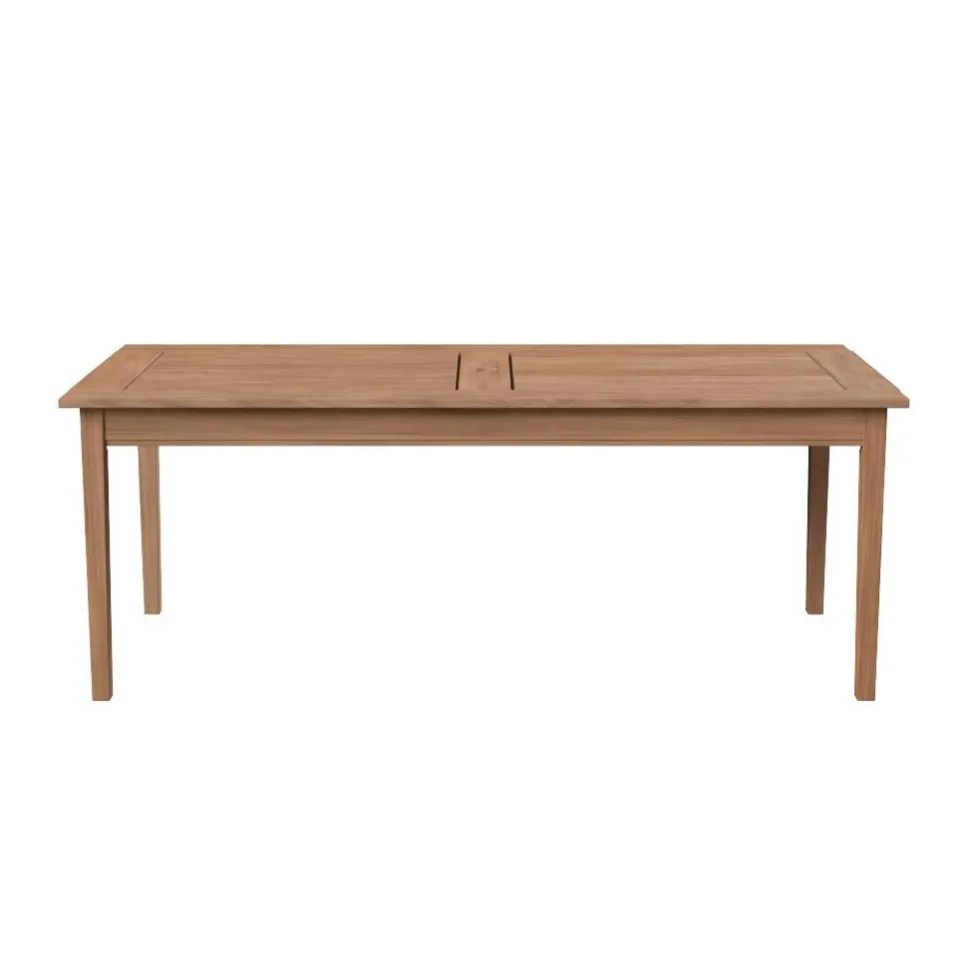 Rummeligt og klassisk bord, der på fineste vis balancerer nordisk nostalgi og moderne enkelhed. Det rektangulære bord er fremstillet i FSC-certificeret teak og designet i samarbejde med Mogens Holmriis. Bordet thar plads til 6-8 personer og er udført med et praktisk hul i midten, hvori der med fordel kan placeres en parasol.