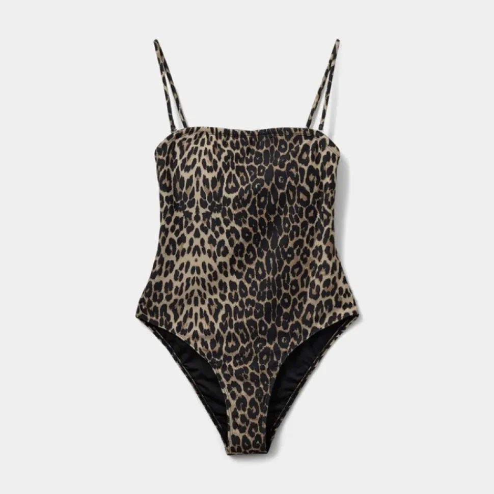 Elegant badedragt med moderne leopardprint og smalle, justerbare stropper for optimal pasform. Den tætsiddende silhuet former kroppen flot og er fremstillet i en elastisk og komfortabel kvalitet – perfekt til både svømmeture og solbadning.
