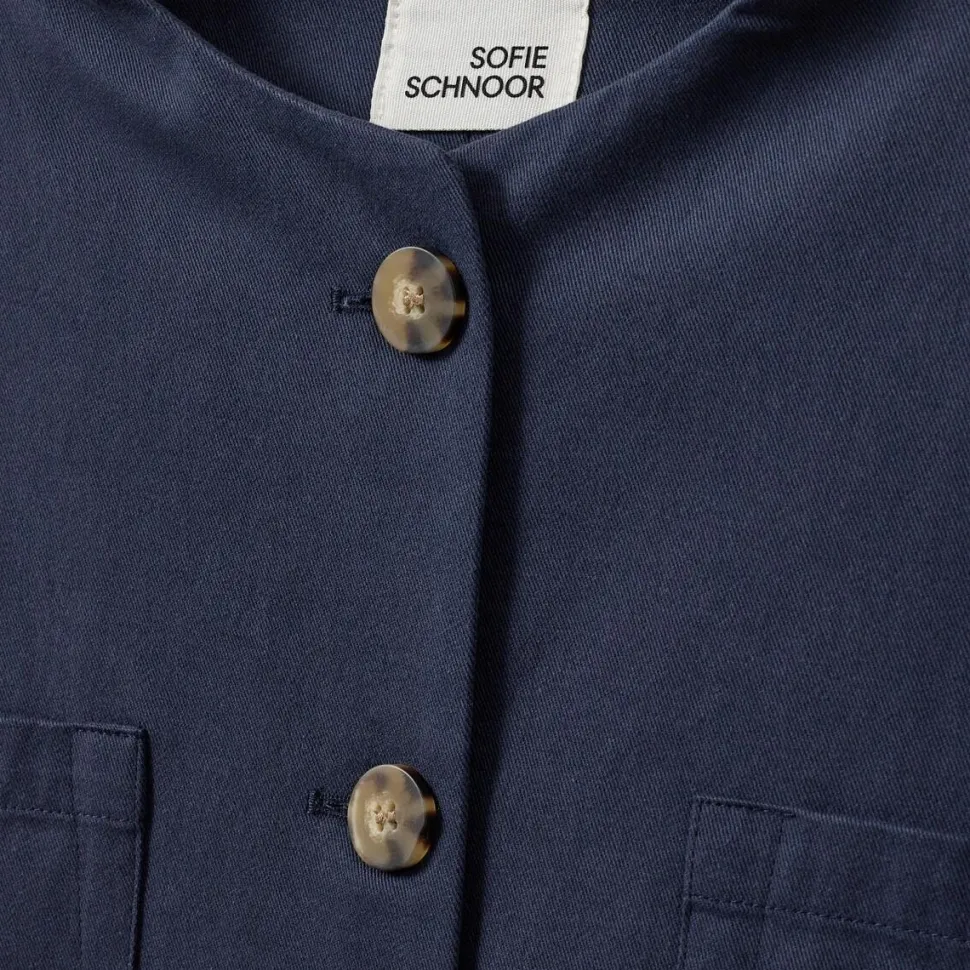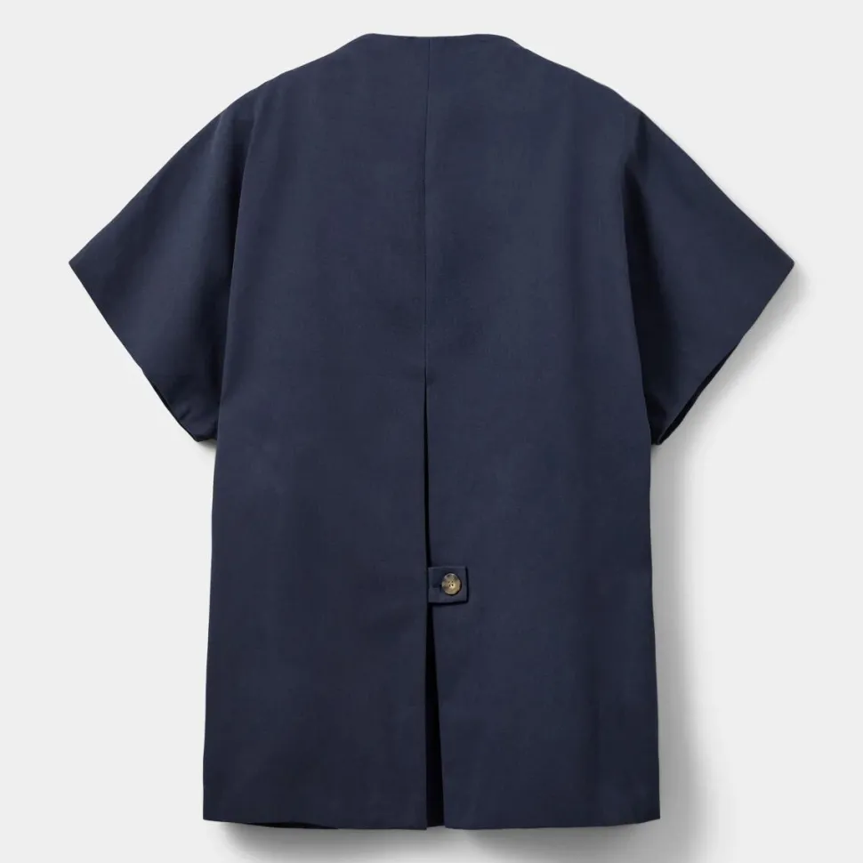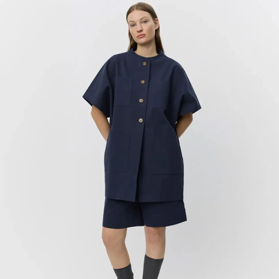 Enkel, praktisk og alligevel fuld af charme. Den dybe farvenuance tilfører et klassisk udtryk, mens korte ærmer og rund hals skaber en let og moderne silhuet. Knaplukningen foran og de fire lommer kombinerer funktionalitet med stilfulde detaljer, således jakken både er praktisk og visuelt interessant. Jakken er ideel som et let lag til både hverdag og mere polerede outfits.