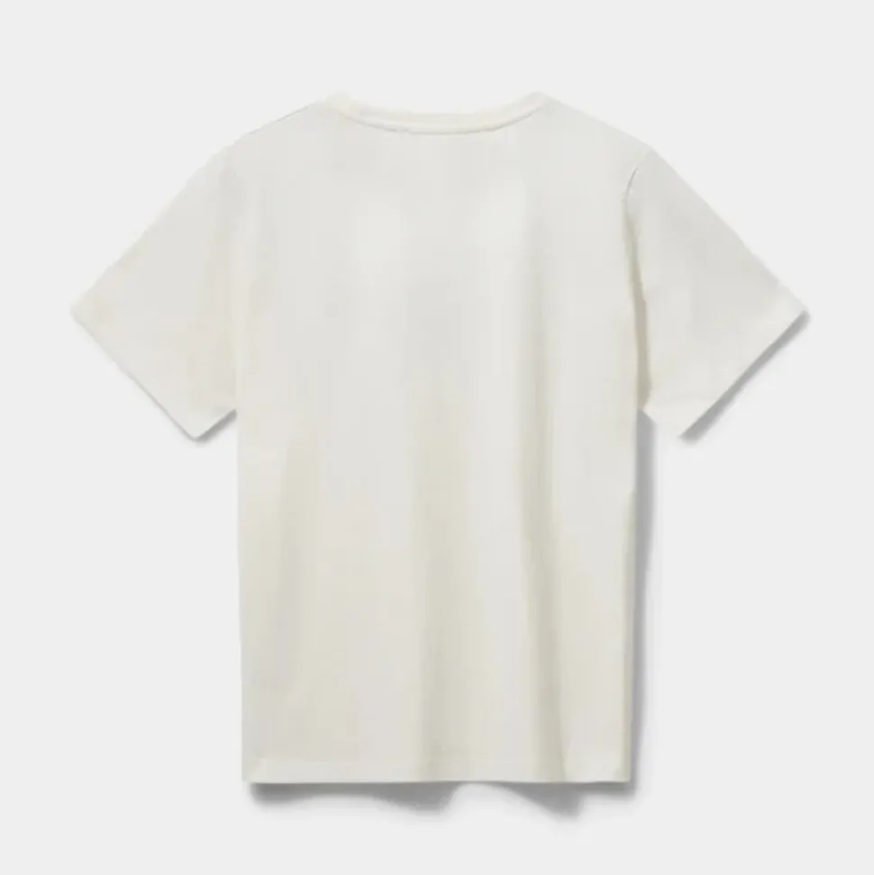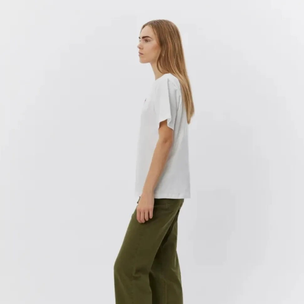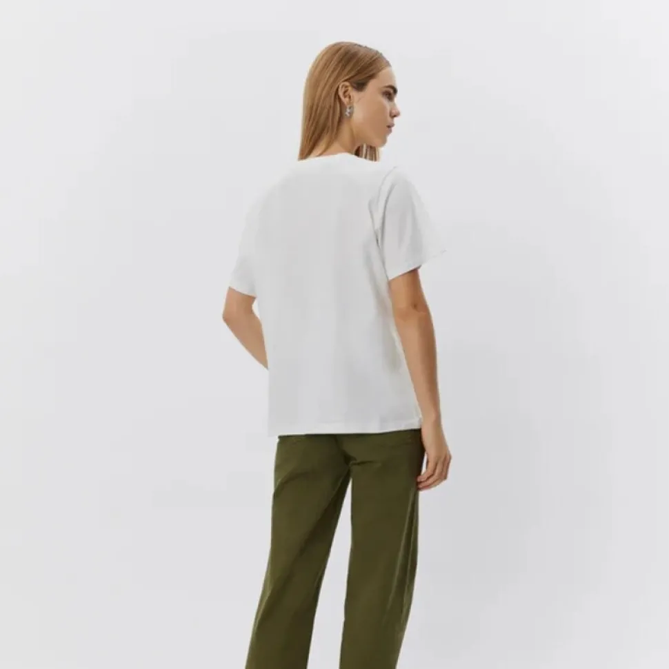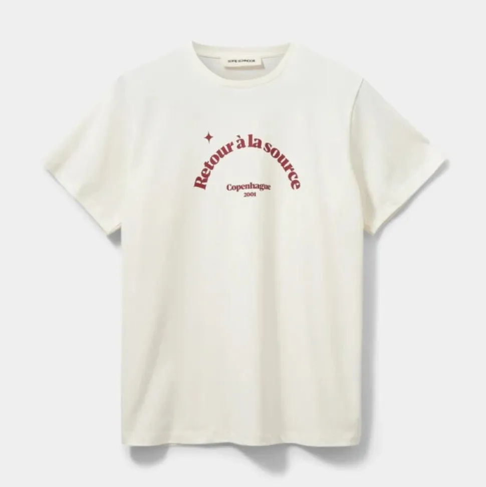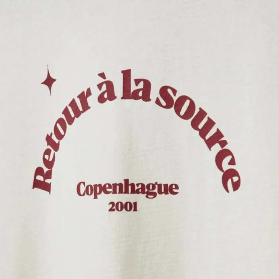 Klassisk hvid T-shirt med rund hals og korte ærmer. Brystet prydes af et rødt tekstprint med ordene “Retour à la source, Copenhague 2001”. Fremstillet i blød bomuld og skåret i en afslappet pasform, der gør den perfekt til både hverdag og afslappede looks.