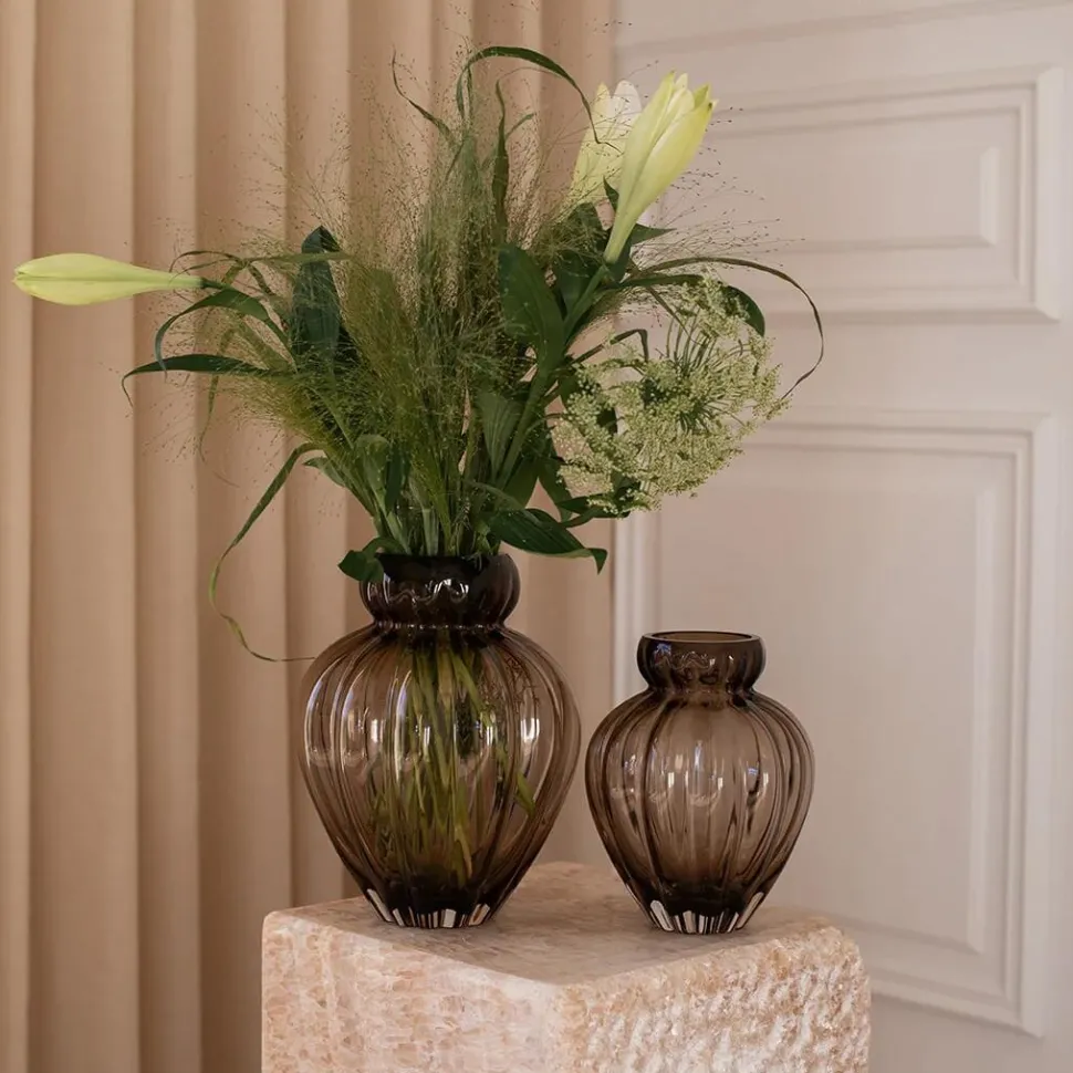 Moderne vase med et skulpturelt formsprog og elegant mønster. Vasen er designet til at være et centralt designobjekt i boligindretningen hele året – uanset blomstertrend og sæson. Vasen er mundblæst, hvorfor der kan forekomme luftbobler og andre ufuldkommenheder – dét er blot en del af charmen.