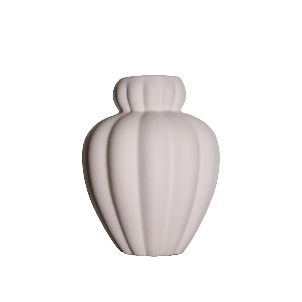Enkel og yndefuld vase, der emmer af elegance. Udtrykket er skulpturelt og formsproget er moderne, hvorfor vasen er designet til at være et centralt designobjekt i boligindretningen. Vasens bølgende linjer, strukturelle sandinspireret overflade og naturlige farvenuance tilfører et unikt touch til indretningen. Hver enkelt vase er håndlavet, hvorfor der kan forekomme variationer og andre ufuldkommenheder.
