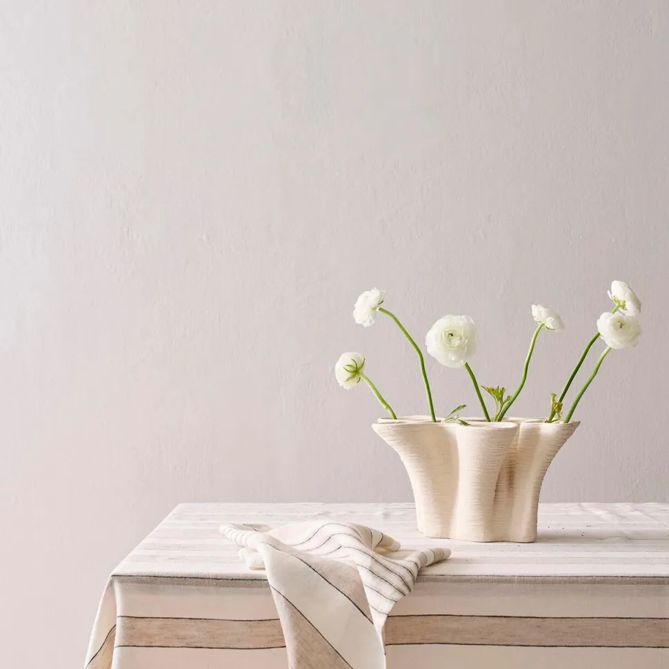 Naturinspireret vase, formet med bløde kurver og en bred, flad profil, der henter sin æstetik fra de rolige linjer i en fjord. Vasen er 3D-printet i porcelænsler, hvilket muliggør de præcise linjer og de intrikate detaljer, der kendetegner designet – former så delikate, at de ville være næsten umulige at opnå i traditionelt håndværk.