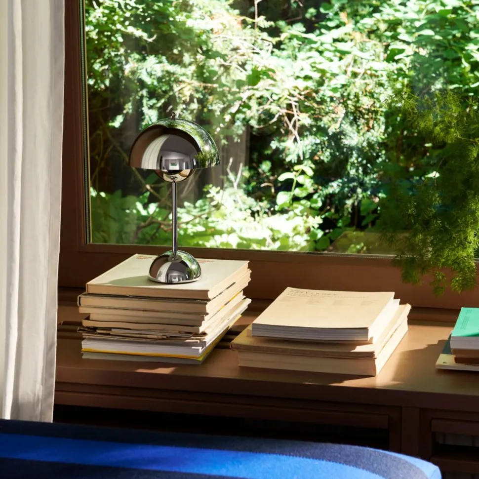 VP9-bordlampen repræsenterer en sofistikeret miniaturisering af det ikoniske Flowerpot-design, hvor form og funktion forenes i et gennemført æstetisk udtryk. Den lette og trådløse konstruktion muliggør fleksibel mobilitet, hvilket gør det muligt at integrere lampen i forskellige rumlige kontekster uden kompromis på designkvalitet.