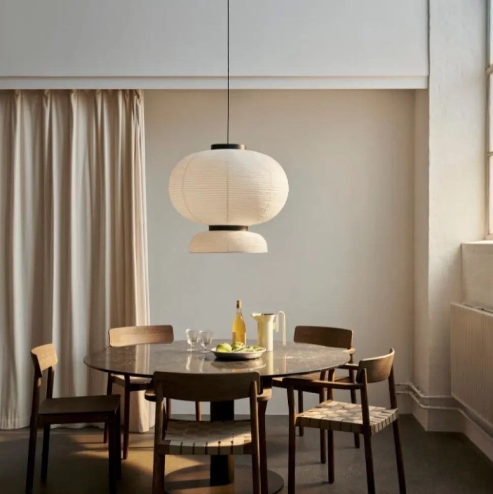 Håndlavet med rispapir, der blander forskellige størrelser og former sammen. Serien består af tre forskellige lanterneversioner og en bordlampe i elfenben-hvidt papir med sortbejdset egedetaljer.