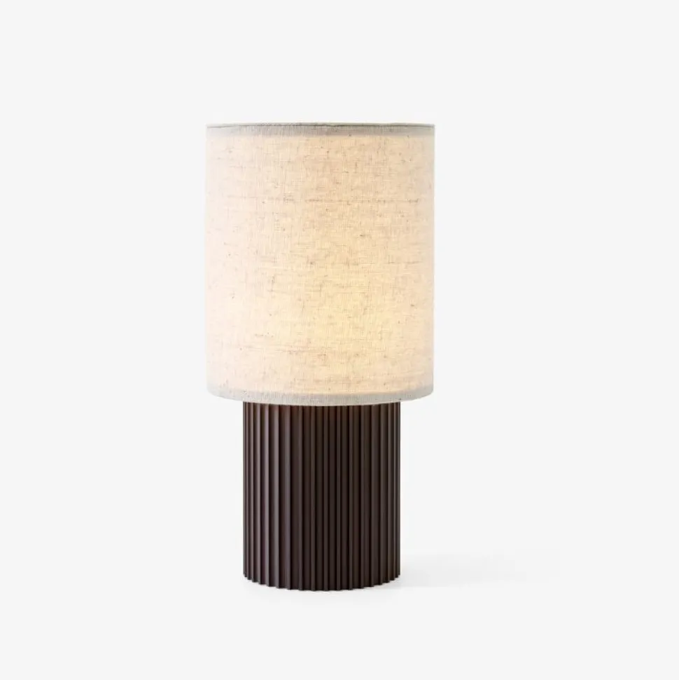 Hyggelig bærbar lampe designet af Space Copenhagen. Dens industri-inspirerede base er lavet af anodiseret aluminium med søjledetaljer. Den cremefarvede lærredsskærm på toppen giver lampen en varme, perfekt til ethvert miljø. Lampen kan fungere i elleve timer ved den højeste indstilling, med en ekstra batterimulighed, der tillader yderligere drift. Den genoplades nemt med et magnetisk USB-kabel eller en opladningsbakke.