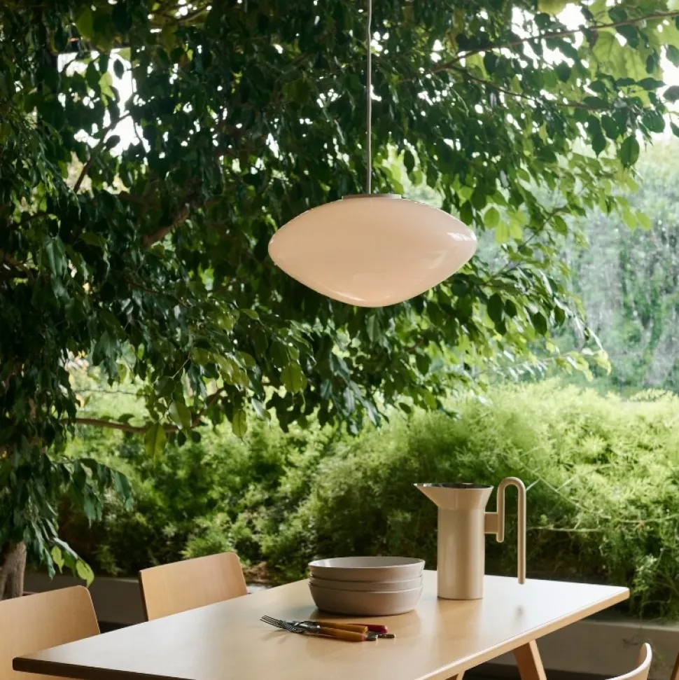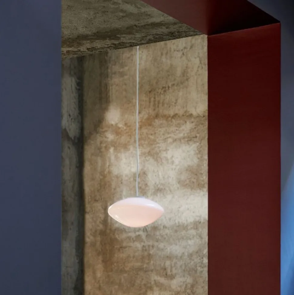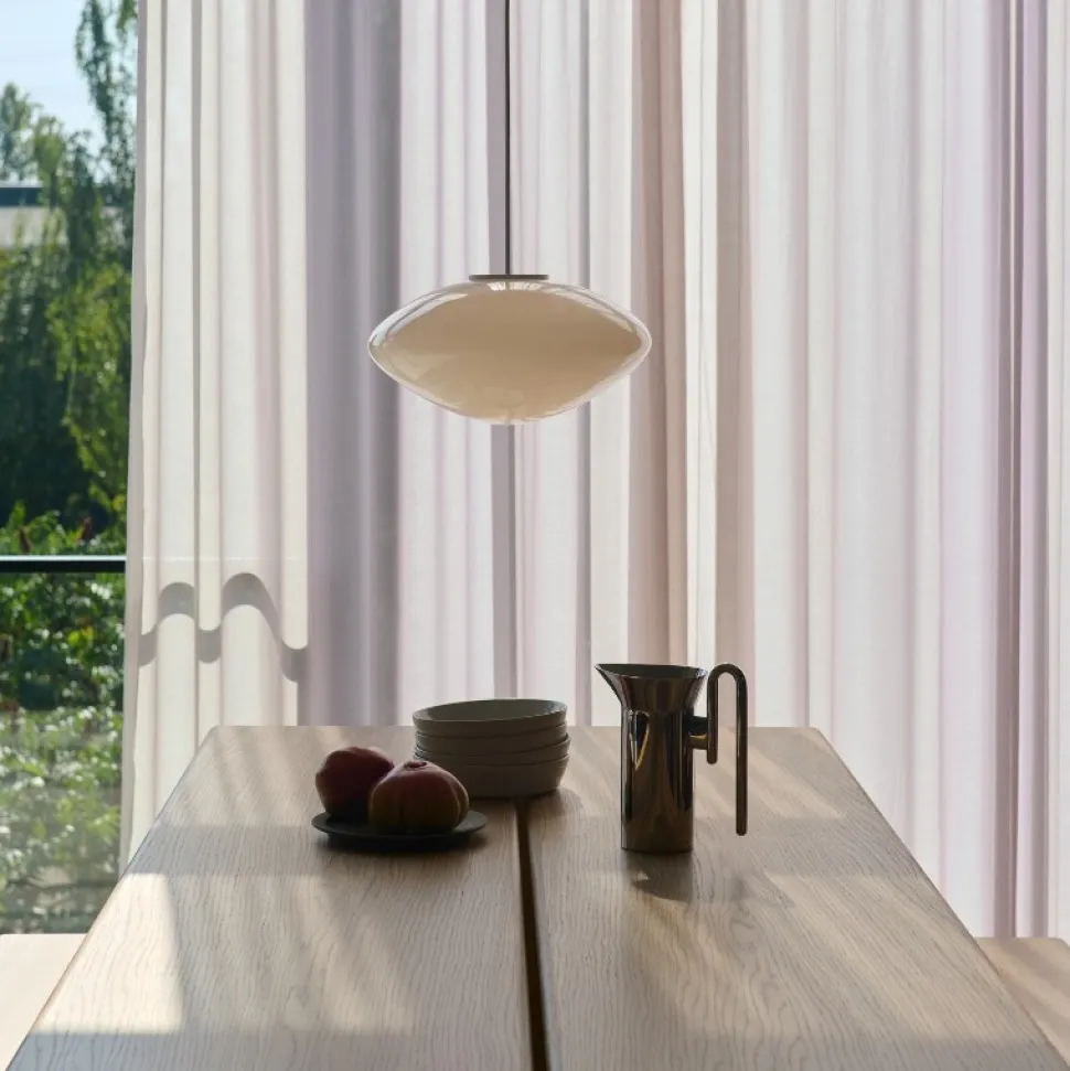 Mist serien er essensen af elegance og varme. Serien er inspireret af det varme, diffuse lys fra morgenstråler, der skinner gennem disen, og tilbyder et moderne bud på den klassiske globuslys-silhuet. Mist pendlen er lavet af mundblæst opalglas med hvidcoatede aluminiumsdetaljer og en tekstilledning og fås i to størrelser.