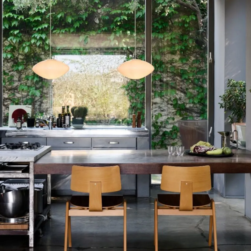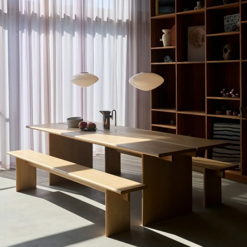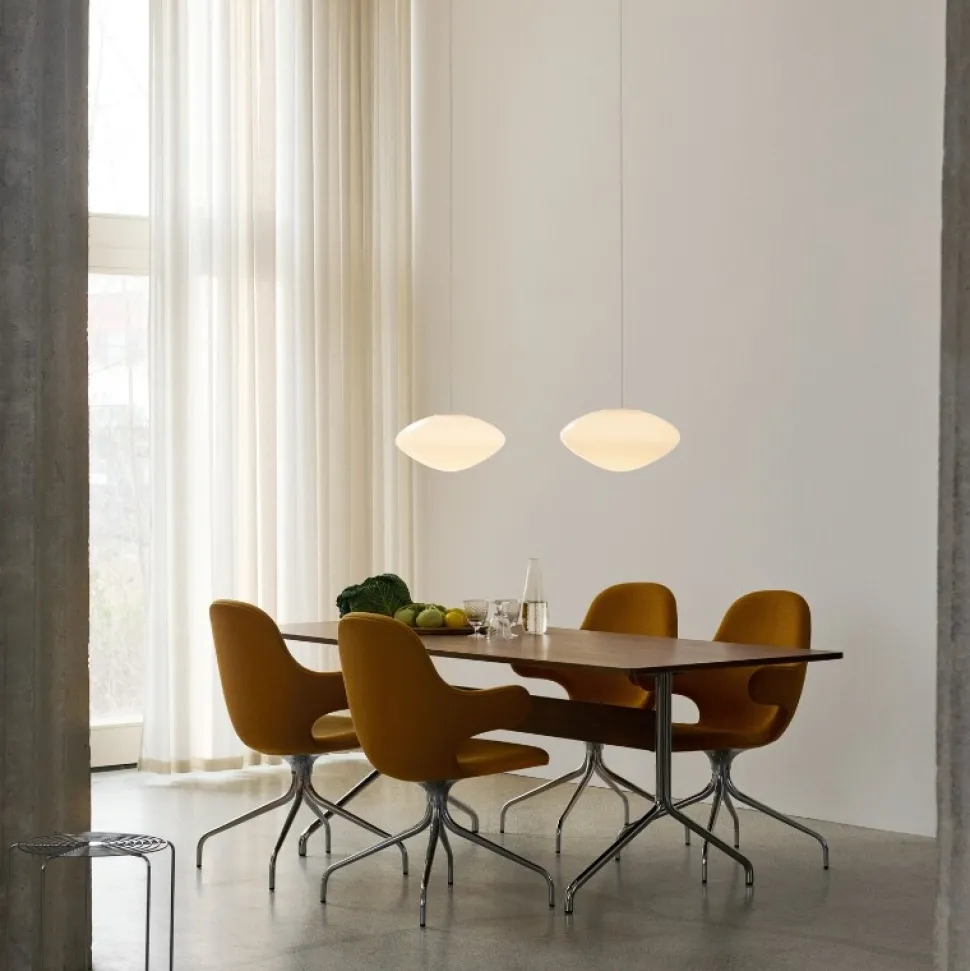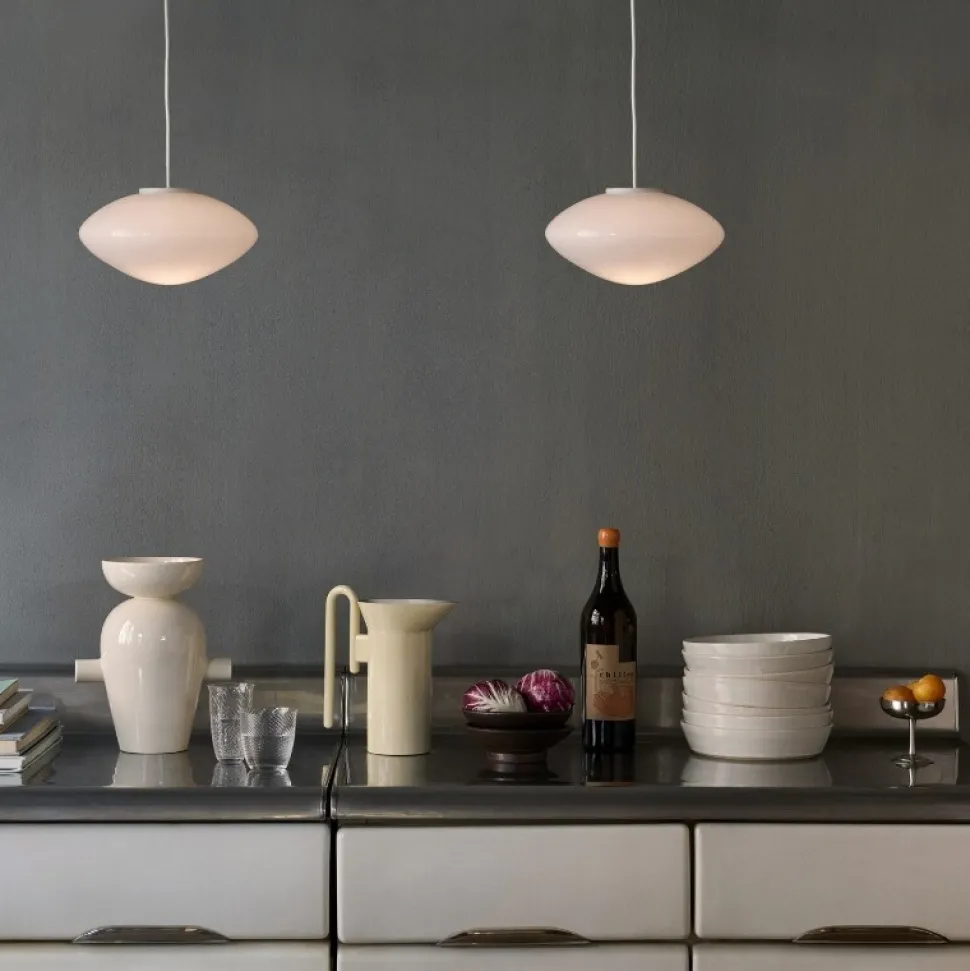 Mist serien er essensen af elegance og varme. Serien er inspireret af det varme, diffuse lys fra morgenstråler, der skinner gennem disen, og tilbyder et moderne bud på den klassiske globuslys-silhuet. Mist pendlen er lavet af mundblæst opalglas med hvidcoatede aluminiumsdetaljer og en tekstilledning og fås i to størrelser.