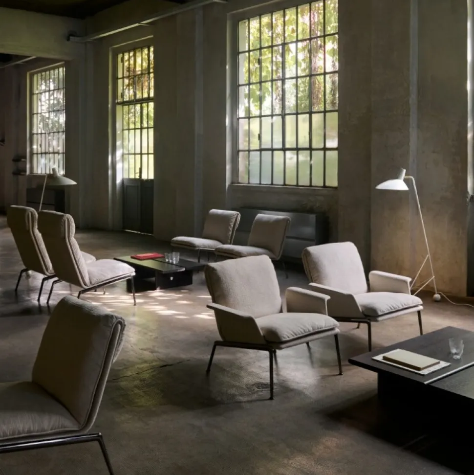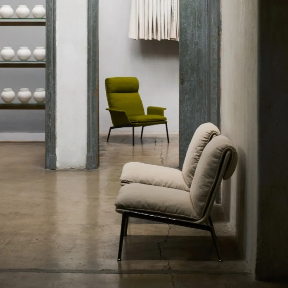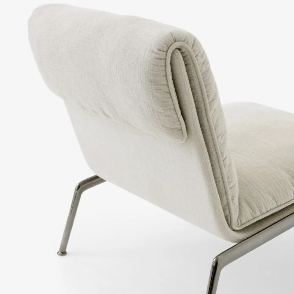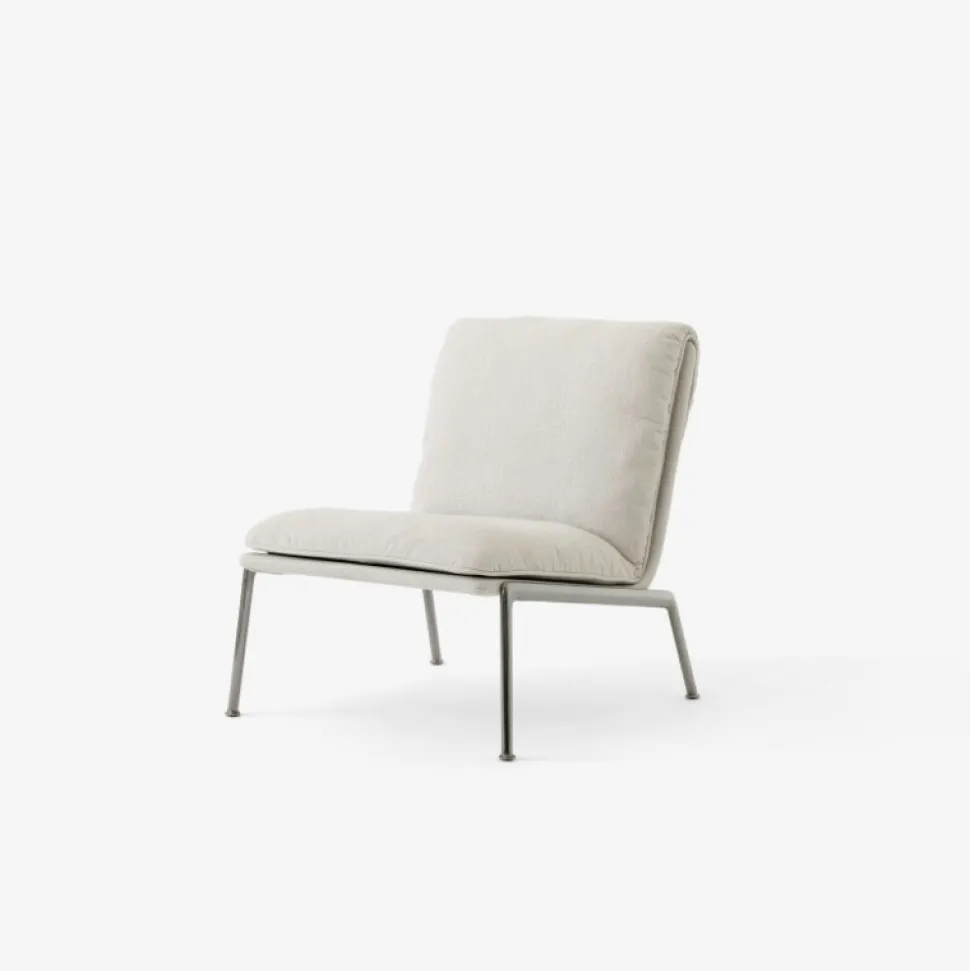 Kendetegnet ved sine plyspuder og slanke, støbte aluminiumsben, tilbyder Muno loungestolen den samme overbevisende oplevelse som sin højere modstykke i en mere kompakt form. Ved at have en enkelt hynde ser stolens sæde og ryglæn ud, som om den var draperet over stellet for at opnå et afslappet, men elegant udtryk.